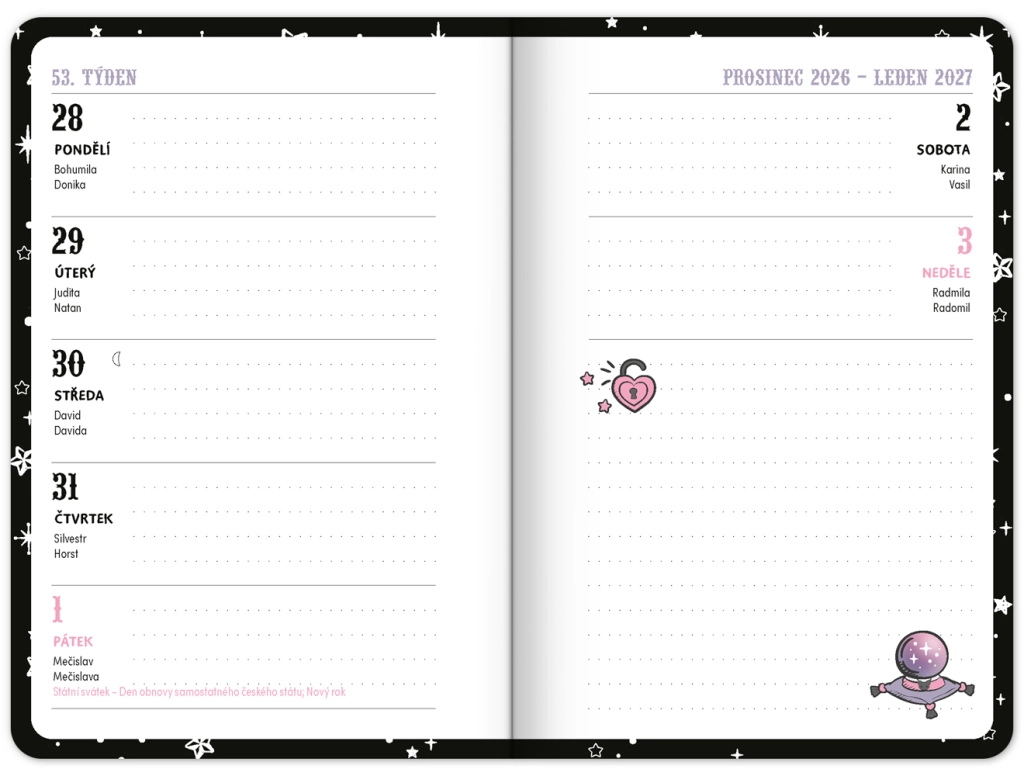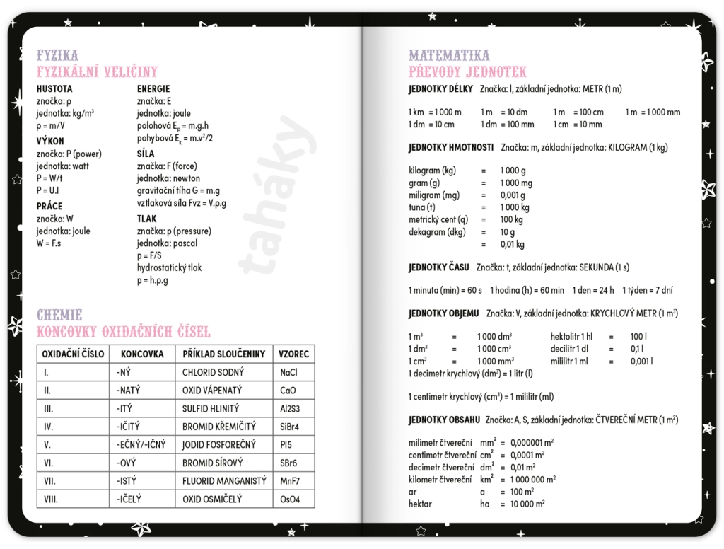 Sastavni dio planera su pametni pomoćnici koji će vam uštedjeti vrijeme pri učenju i planiranju. U njemu ćete naći šalabahtere iz matematike, fizike, kemije i engleskog, rasporede sati za brzu orijentaciju i pregled termina praznika. Jasno raspoređeni dani i tjedni pomoći će vam držati pod kontrolom testove, zadatke i slobodno vrijeme.