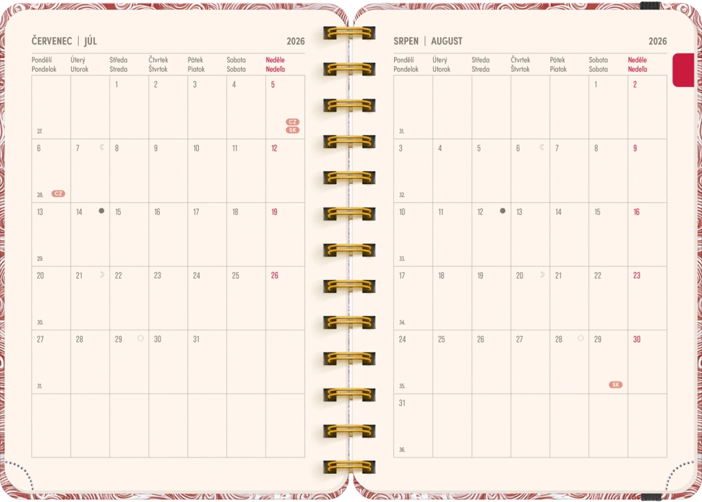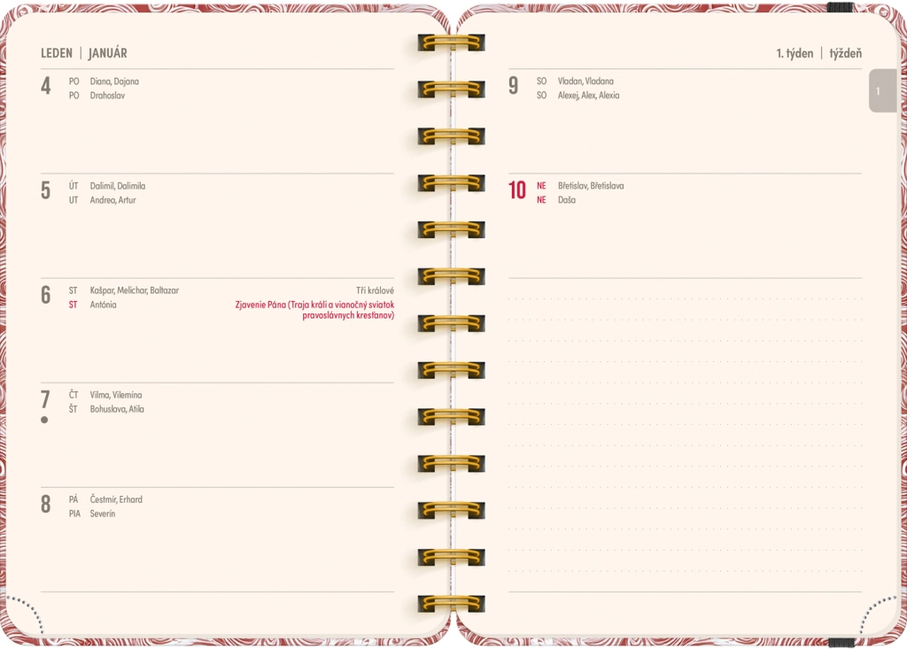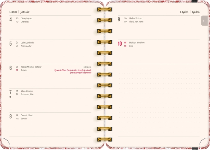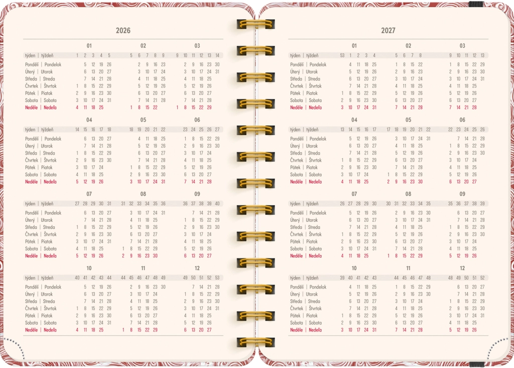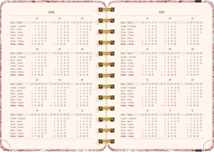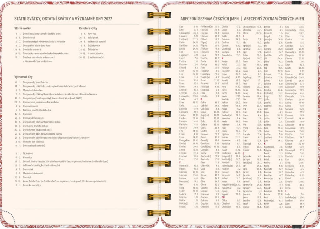 Planer sadrži sve što trebate za učinkovitu organizaciju vremena: godišnje preglede za 2026. i 2027., popis čeških i slovačkih imena te dovoljno mjesta za bilješke u svakom tjednu. Motiv Oblaci vašim planovima daje lakoću i preglednost.