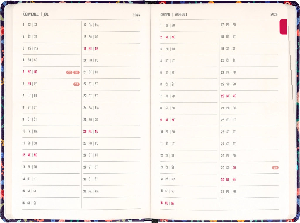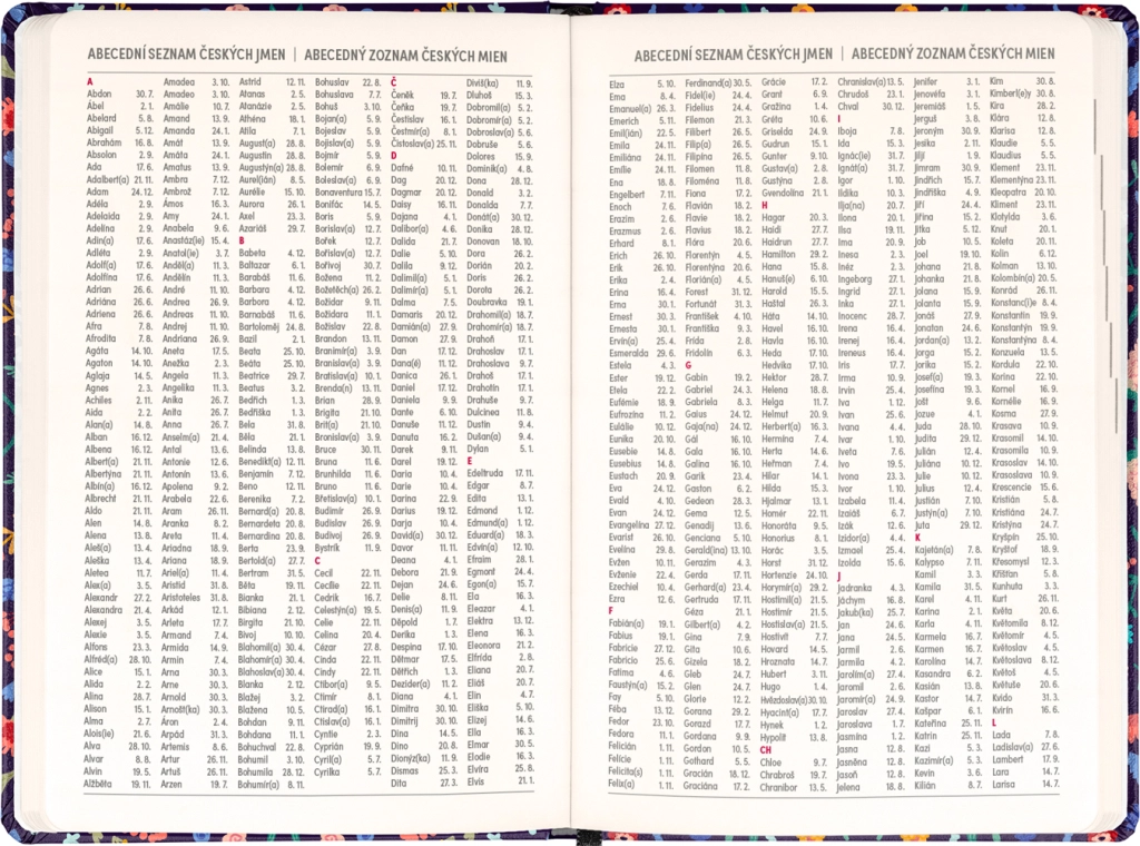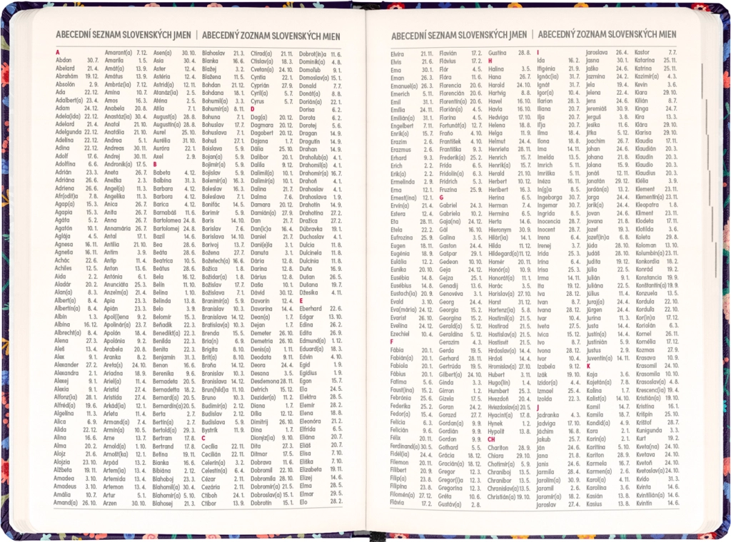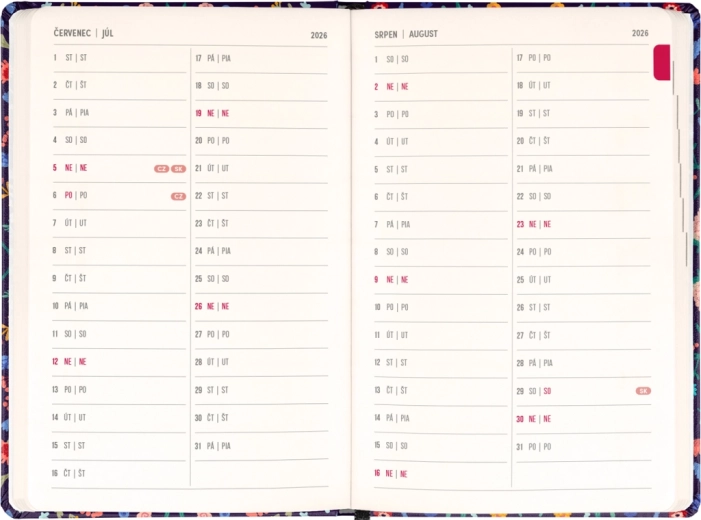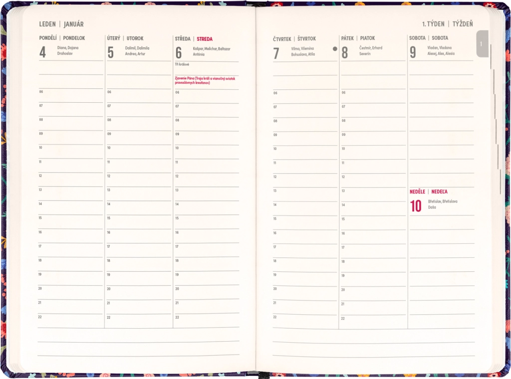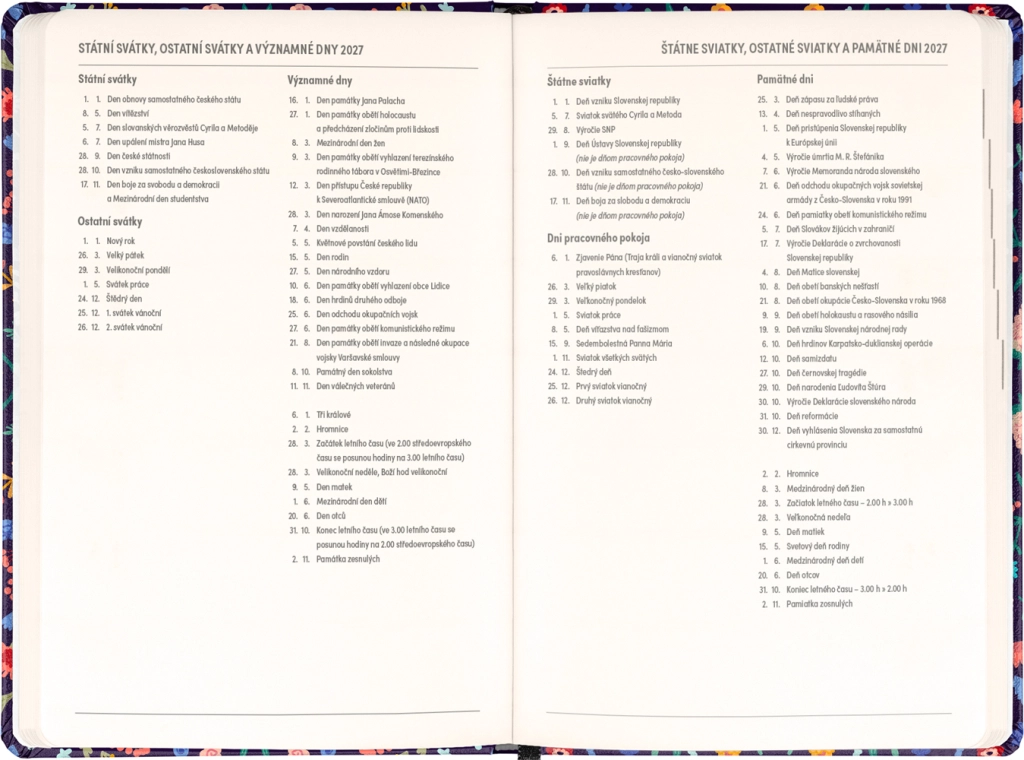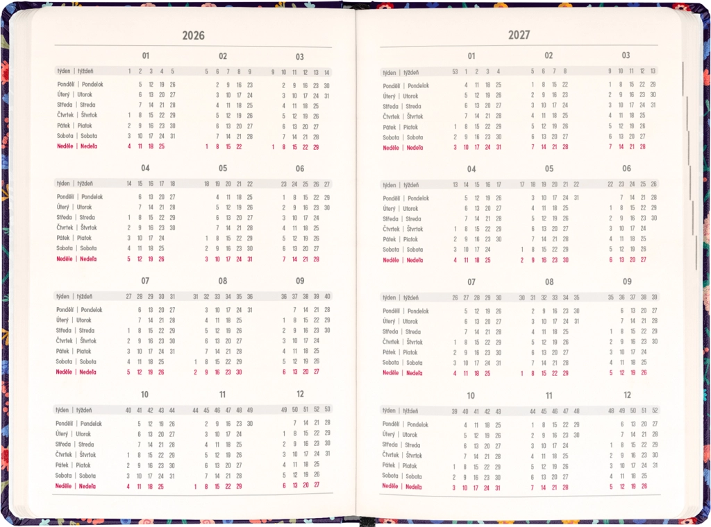 Stilski planer Notique Petito Flora spaja praktično raspoređivanje tjedana u stupce s nježnim cvjetnim dizajnom. Zahvaljujući pregledima za 2026. i 2027. te popisu čeških i slovačkih imena, blagdani i planovi bit će vam uvijek pri ruci.