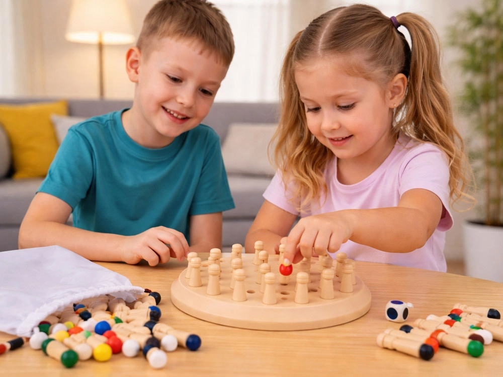 Obojeni krajevi štapića skriveni u otvorima natjeraju igrače da zapamte položaje i boje. Idealna vježba kognitivnih vještina kroz igru.