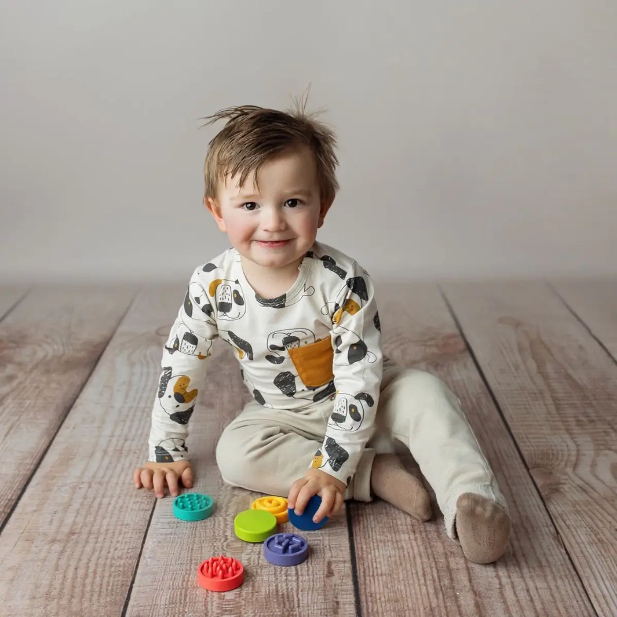Šareni diskovi s različitim površinama potiču prepoznavanje tekstura, boja i oblika. Djeca na zabavan način jačaju osjet dodira i koncentraciju.
