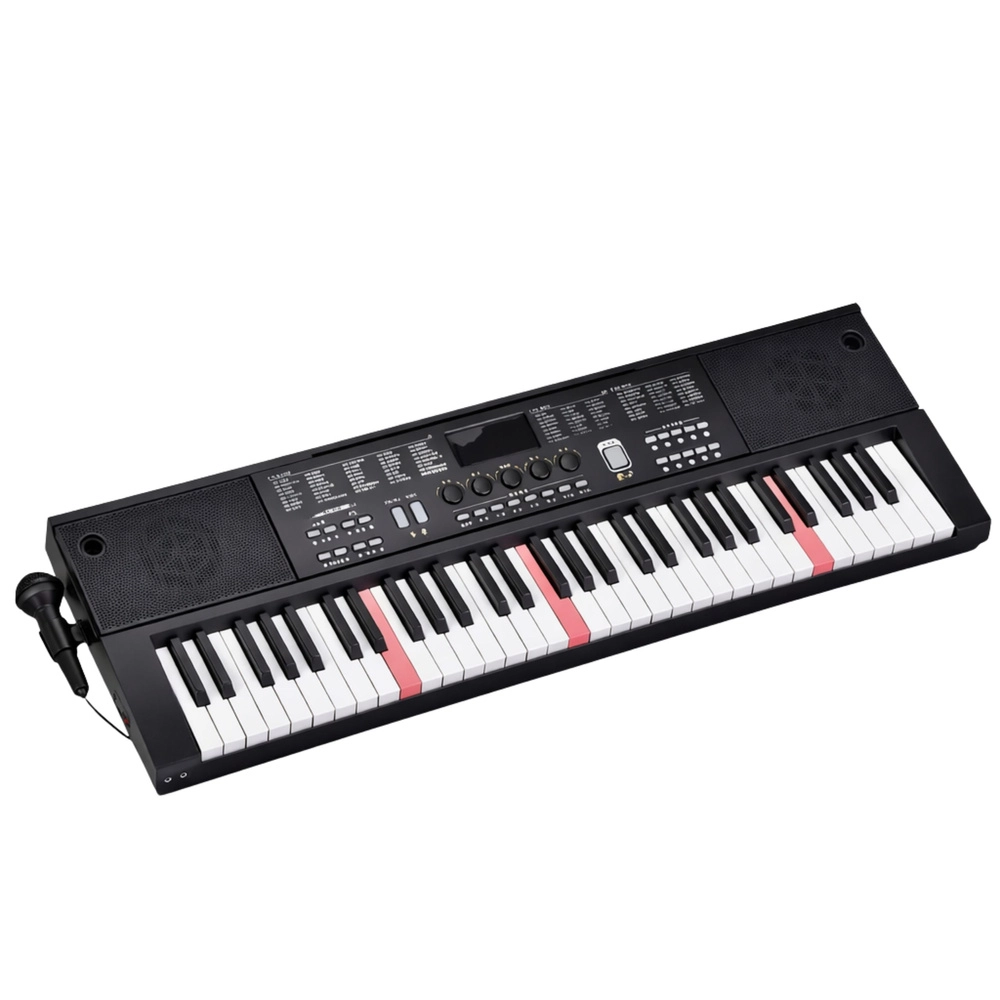 Univerzalna elektronička klavijatura s 61 tipkom, 200 zvukova, 200 pratnji i 70 demo skladbi idealna je za početnike i napredne. Nudi pozadinski osvijetljene tipke Key Light za lakše učenje, pregledan LCD zaslon, edukativne načine rada One Key, Follow, Guide i napajanje putem USB-a. U pakiranju se nalazi i mikrofon te stalak za note.