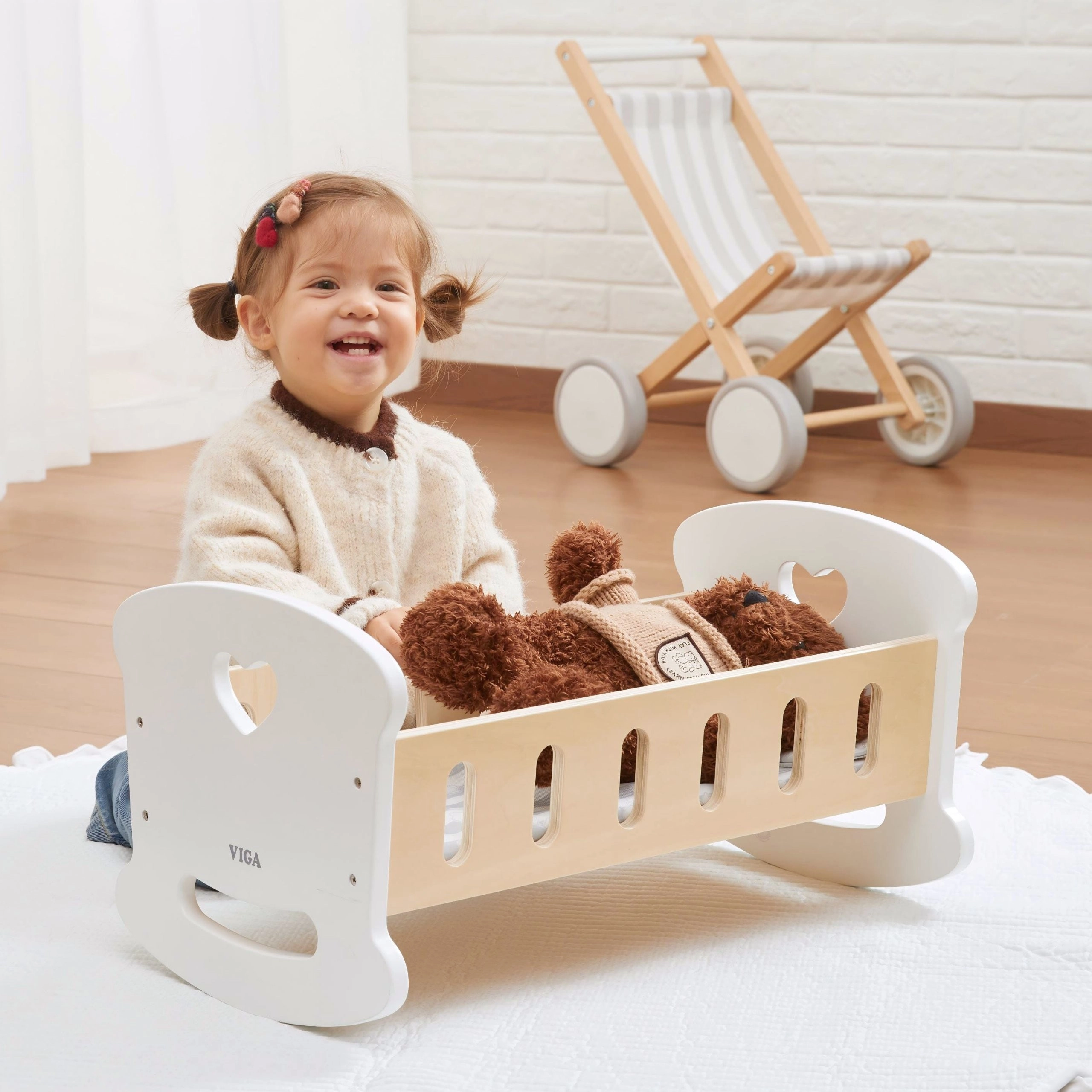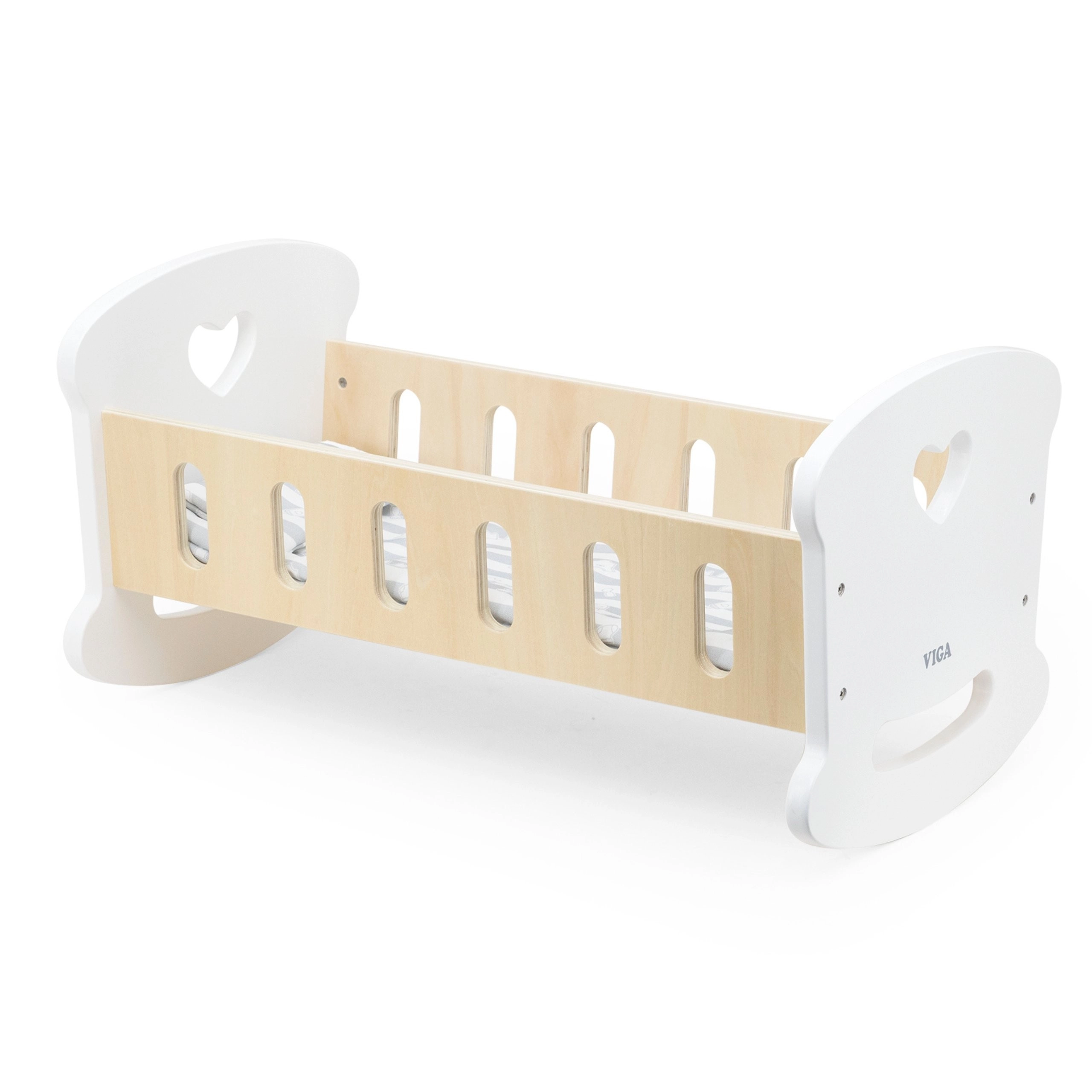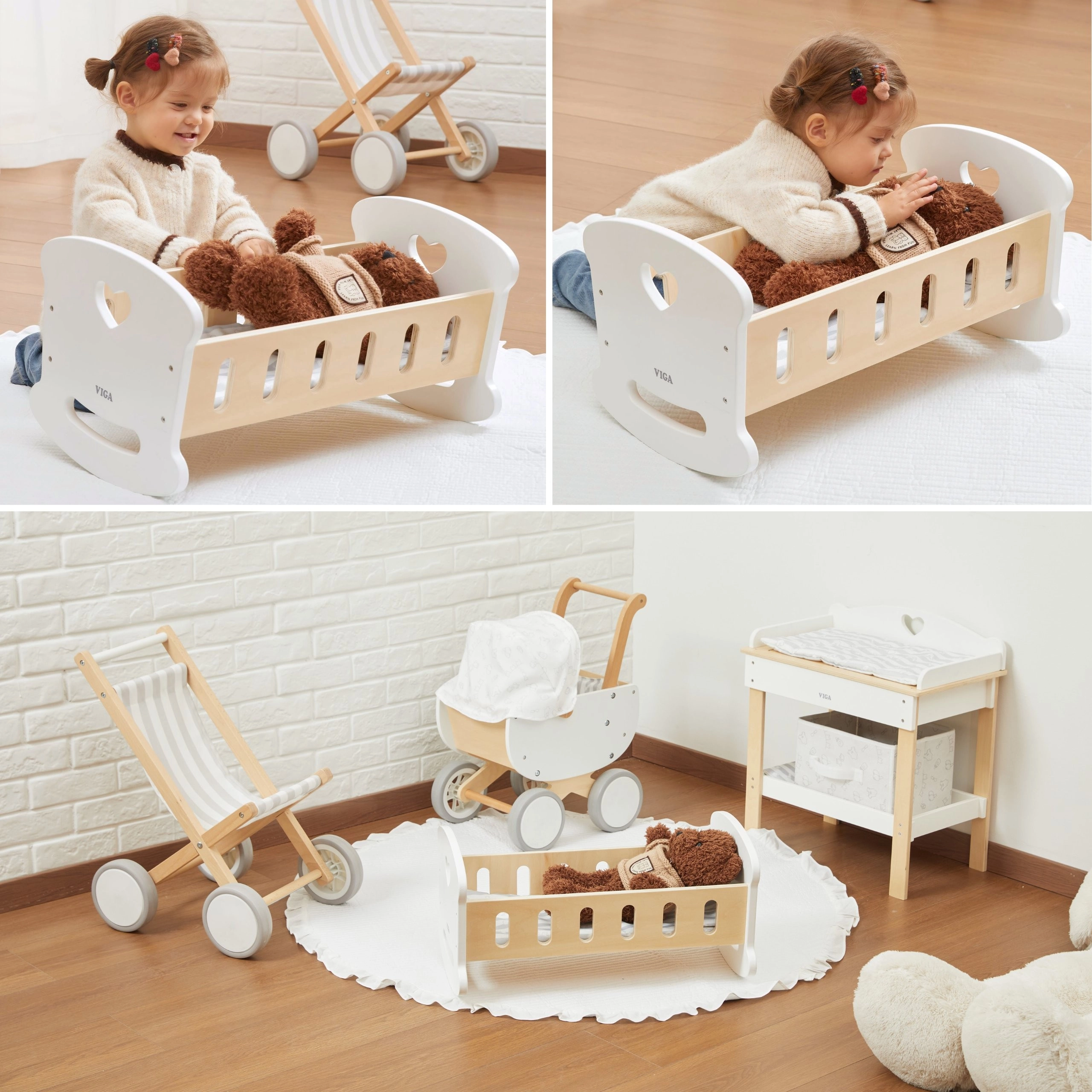 Stvorite djeci njihov čarobni kutak s elegantnom drvenom kolijevkom za lutke Viga sa srcastim motivom. Sigurna i stabilna, prikladna već od 18 mjeseci, nudi nježno ljuljanje za umirujuću igru uspavljivanja i prima lutke do 50 cm. U paketu je mekana posteljina za veću udobnost i realističnu igru.