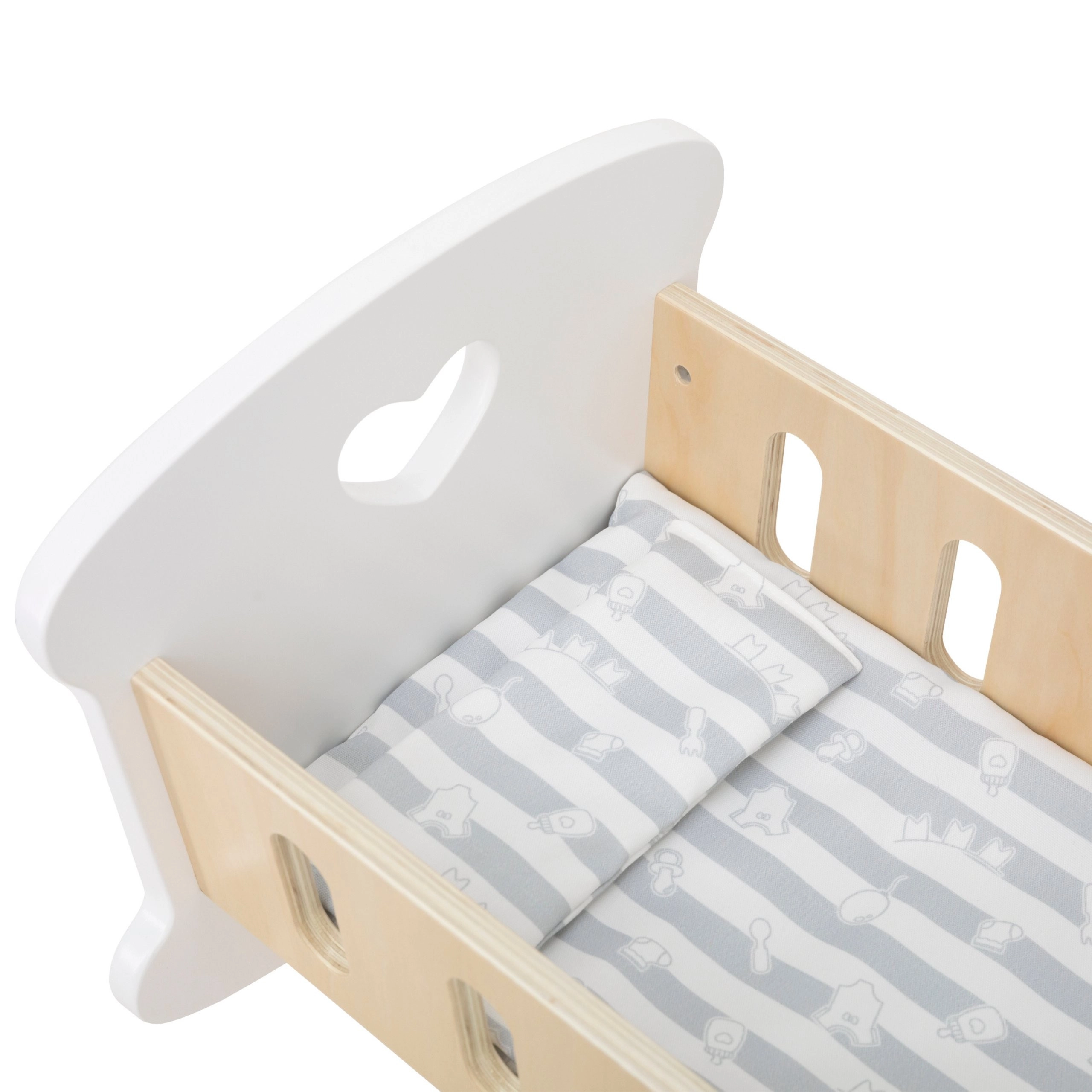 Ova stilska drvena kolijevka spaja čvrstu konstrukciju, glatke rubove i privlačan dizajn s izrezima u obliku srca. Zahvaljujući klizačima omogućuje glatko i tiho ljuljanje koje potiče mirnu igru i razvoj mašte. Idealan dodatak dječjoj sobi koji će razveseliti male skrbnike i njihove omiljene lutke i plišance.