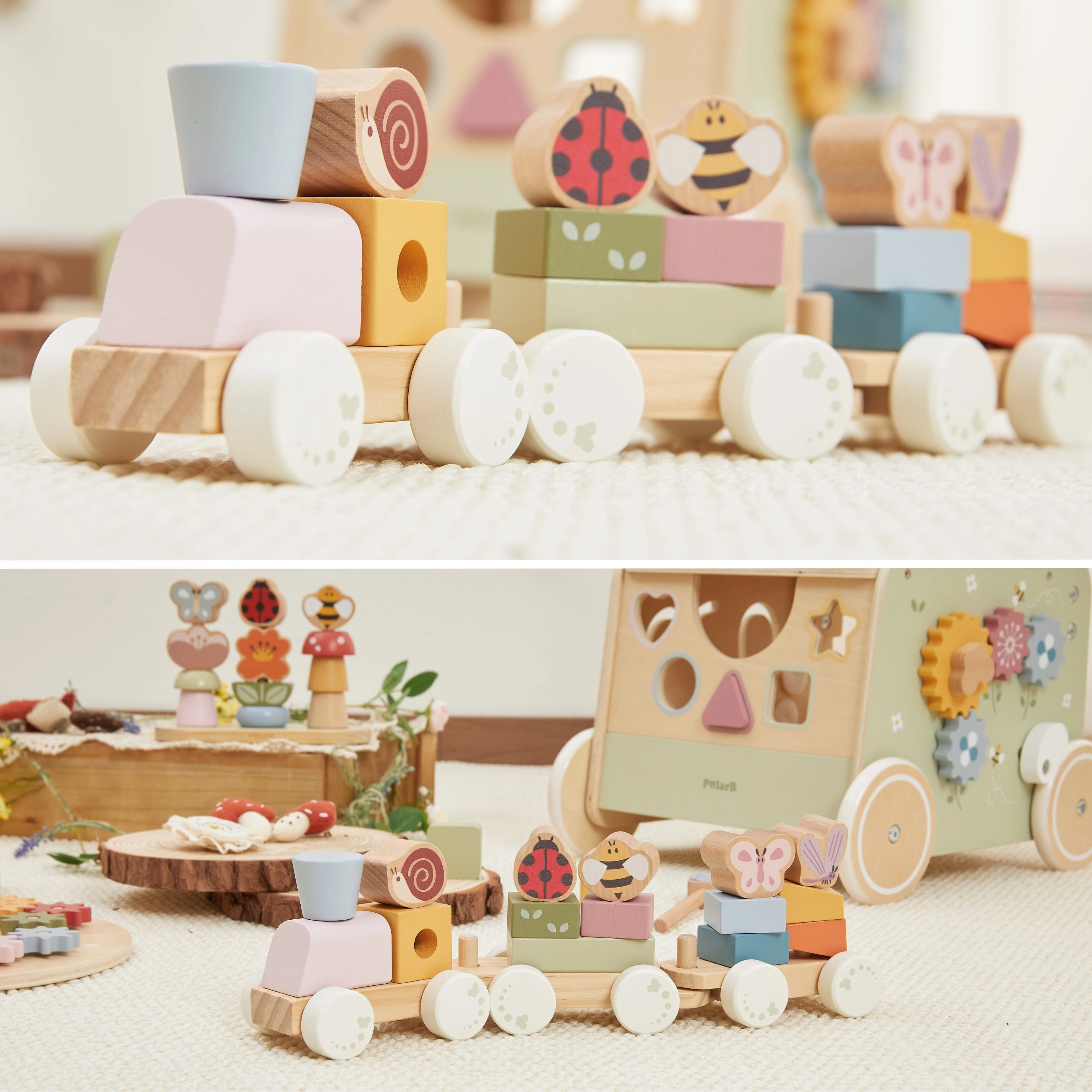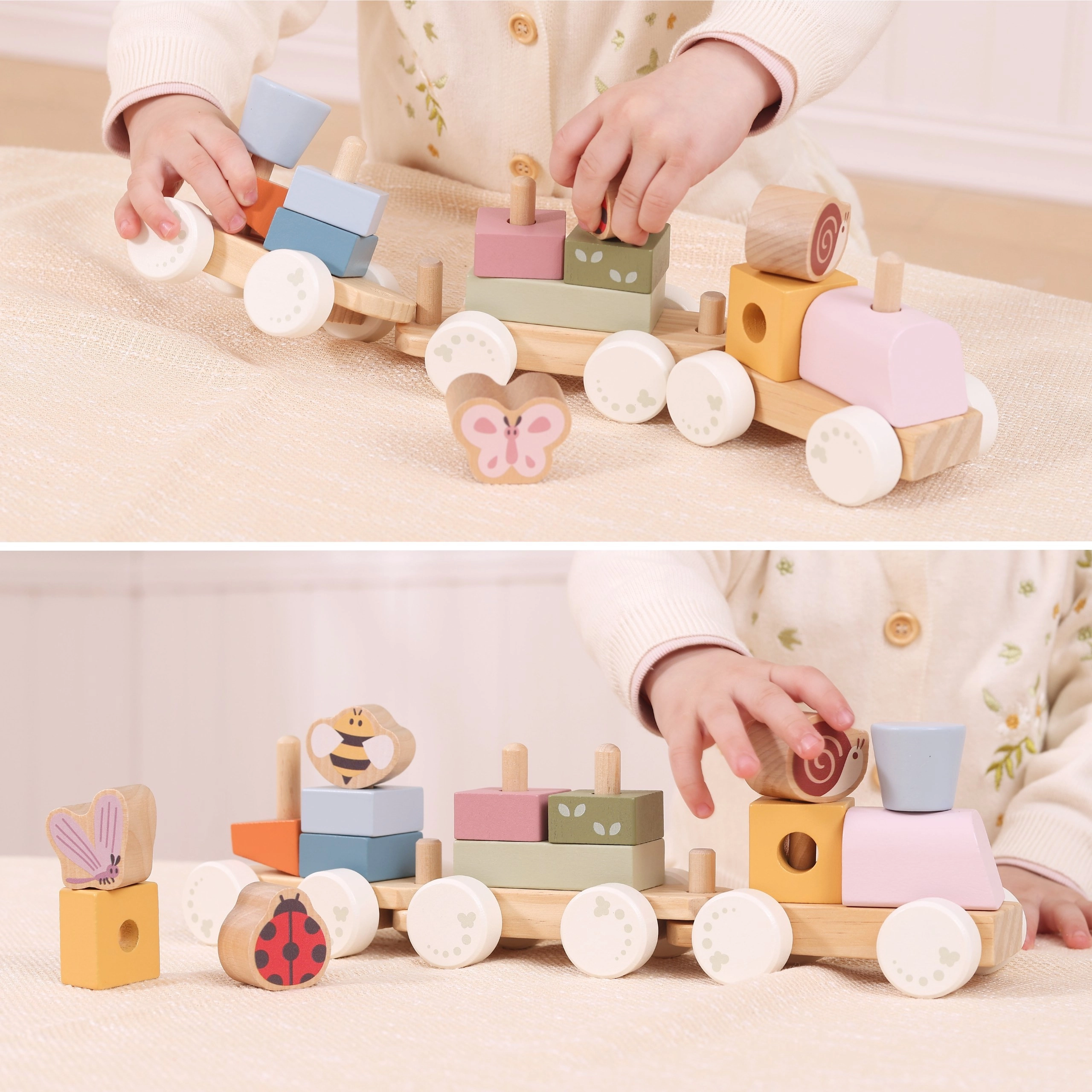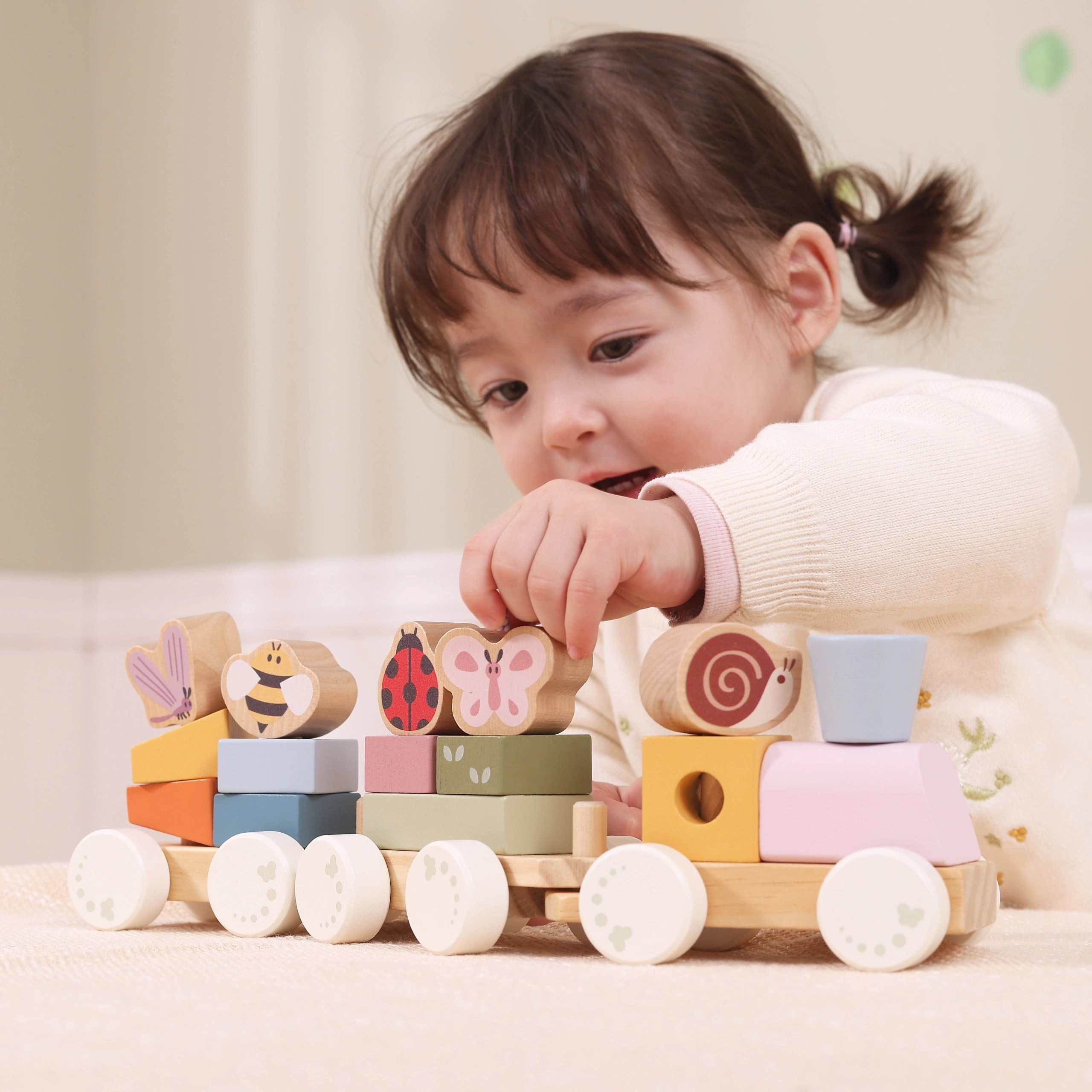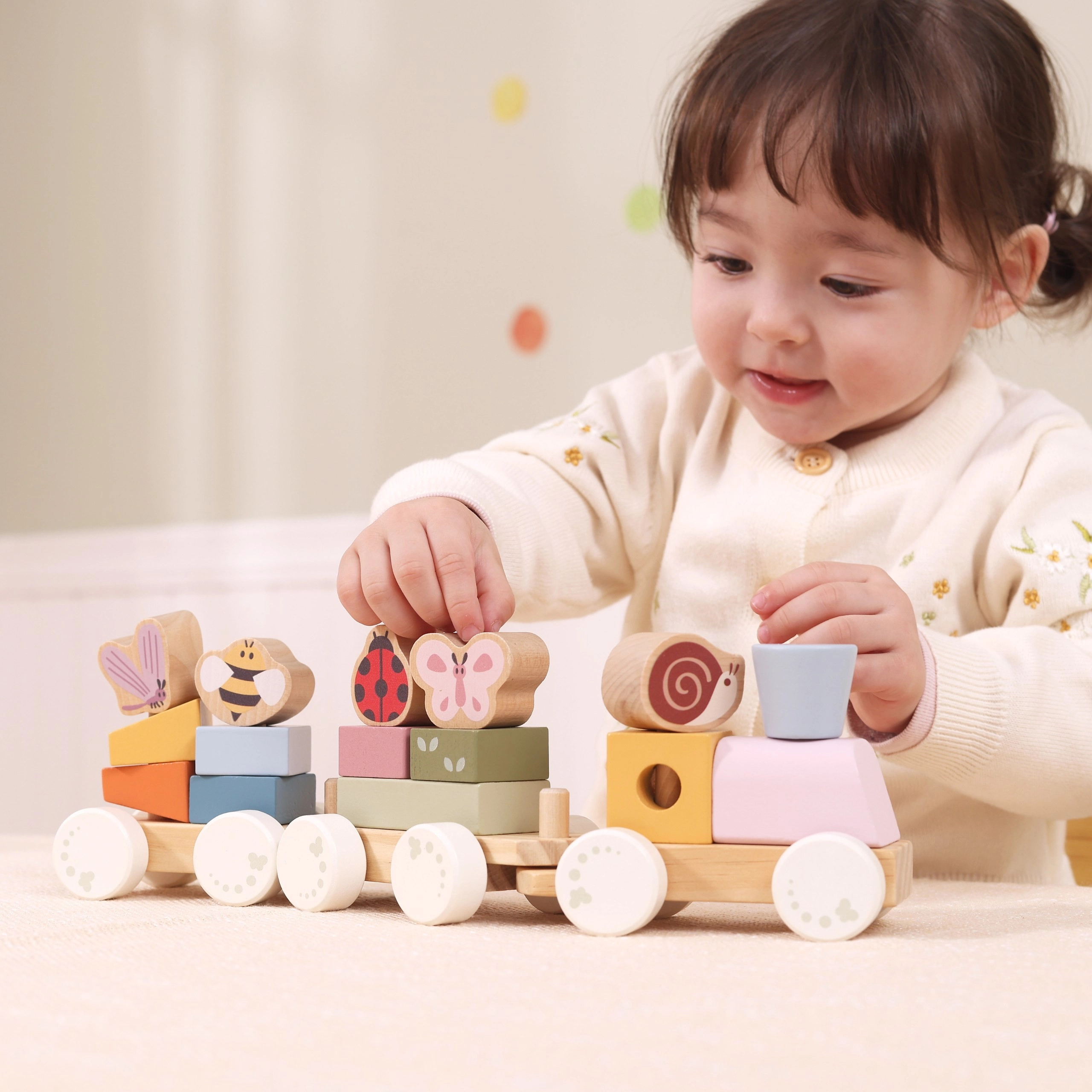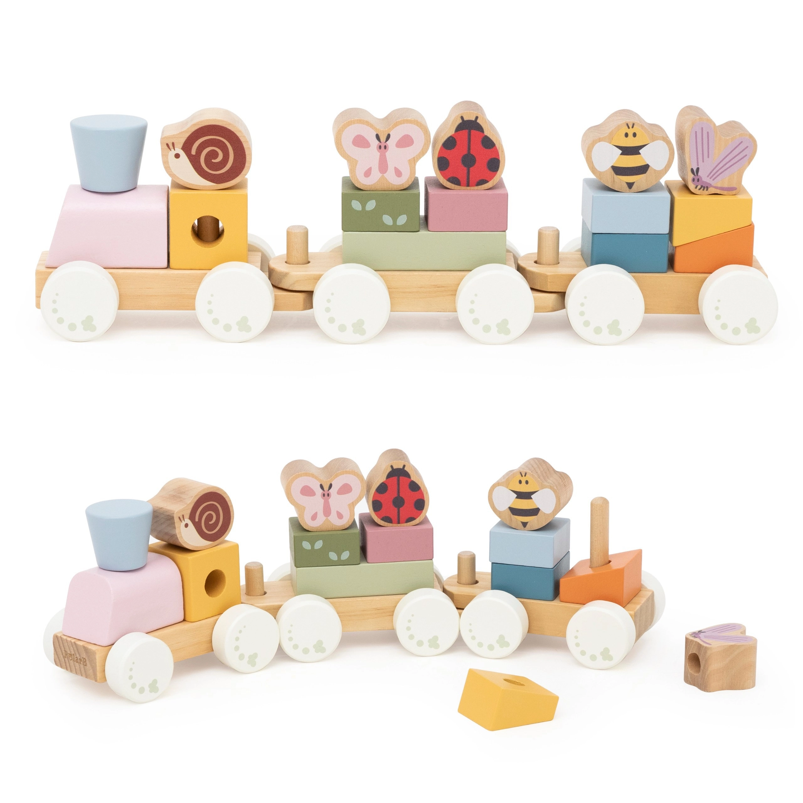Drveni vučni vlakić s trima vagončićima i 18 dijelova idealan je za djecu od 18 mjeseci. Zahvaljujući raznim oblicima i životinjskim motivima (pčelica, leptir, bubamara, puž) djeca uče prepoznavati boje i oblike, vježbaju finu motoriku i koordinaciju ruka–oko. Glatka drvena izrada i nježne boje ugodne su na dodir i pogled.