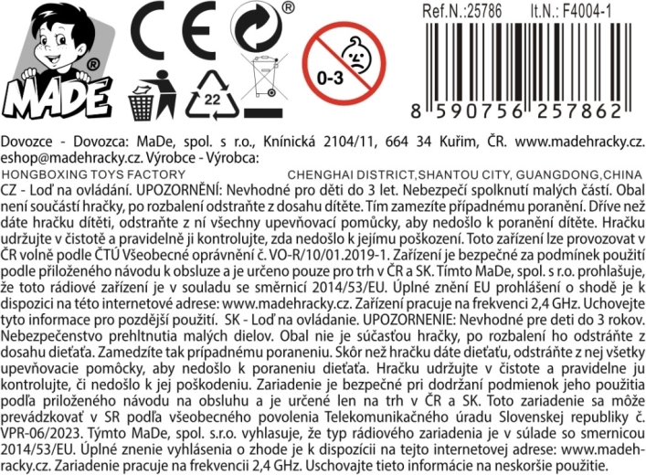Model dolazi s baterijom 3,7 V (AA tip pakiranja) i spreman je za zabavu gotovo odmah nakon raspakiravanja. Zahvaljujući ergonomskom upravljaču s dvama joystickovima, plovidba je intuitivna i precizna, što će cijeniti i početnici i iskusni vozači.