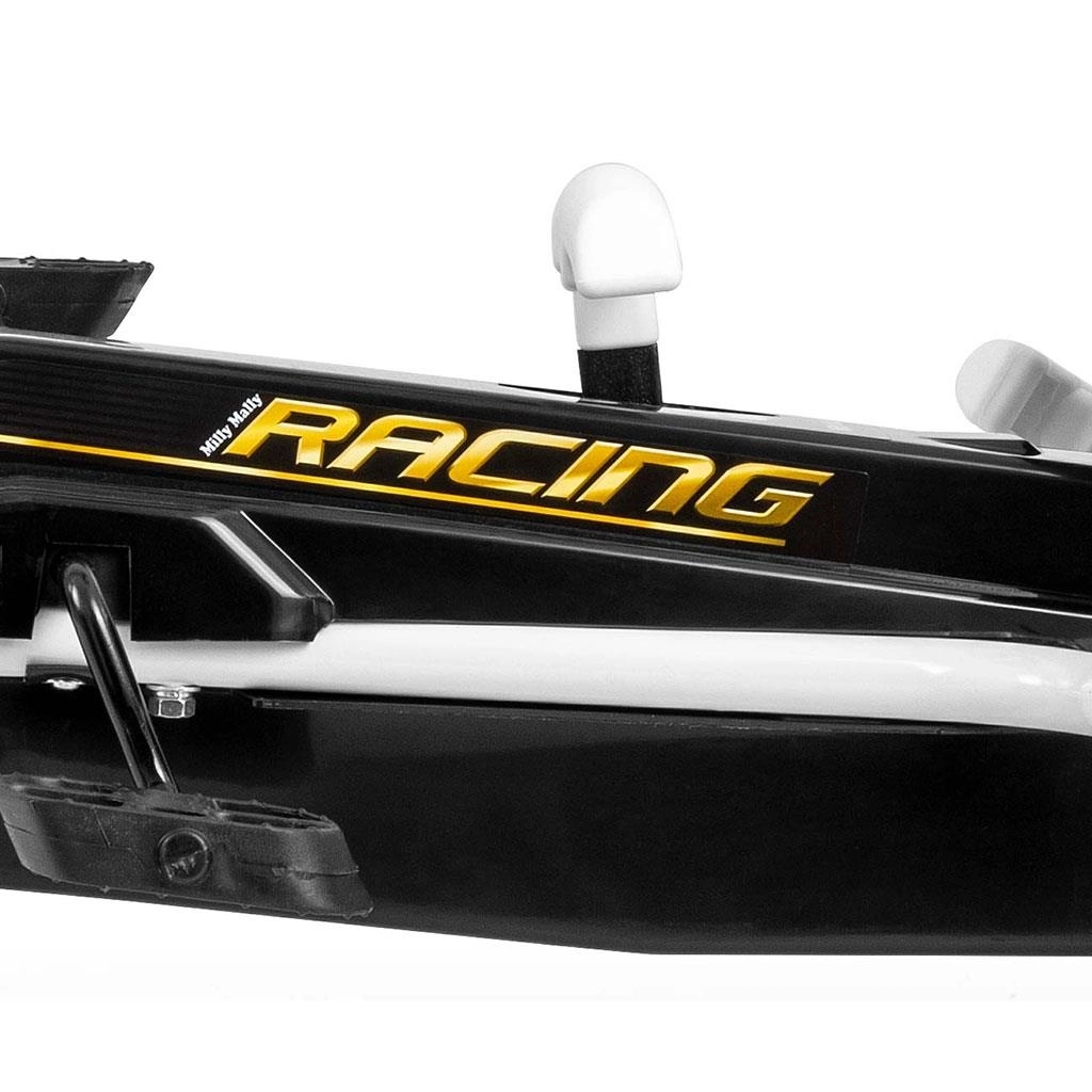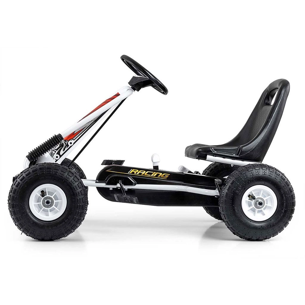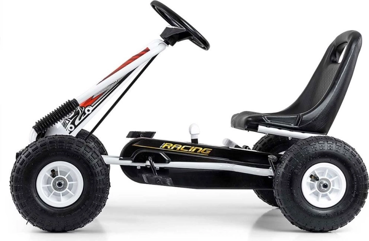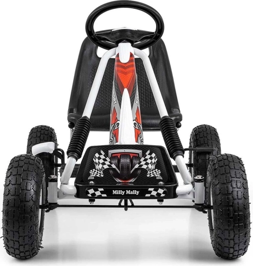 Karting MILLY MALLY Thor odličan je izbor za male vozače u dobi 3–8 godina. Lagana, ali čvrsta metalna konstrukcija s plastičnim zaštitama daje sportski izgled i izdržljivost. Zahvaljujući velikim pneumatskim gumama s izraženim profilom, vožnja je stabilna i udobna na asfaltu, pločniku i utabanim stazama.