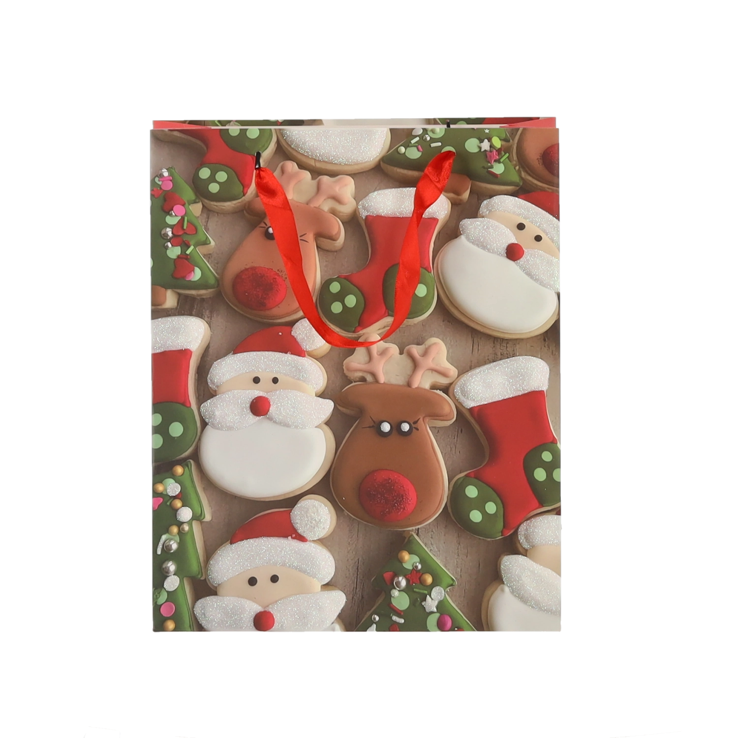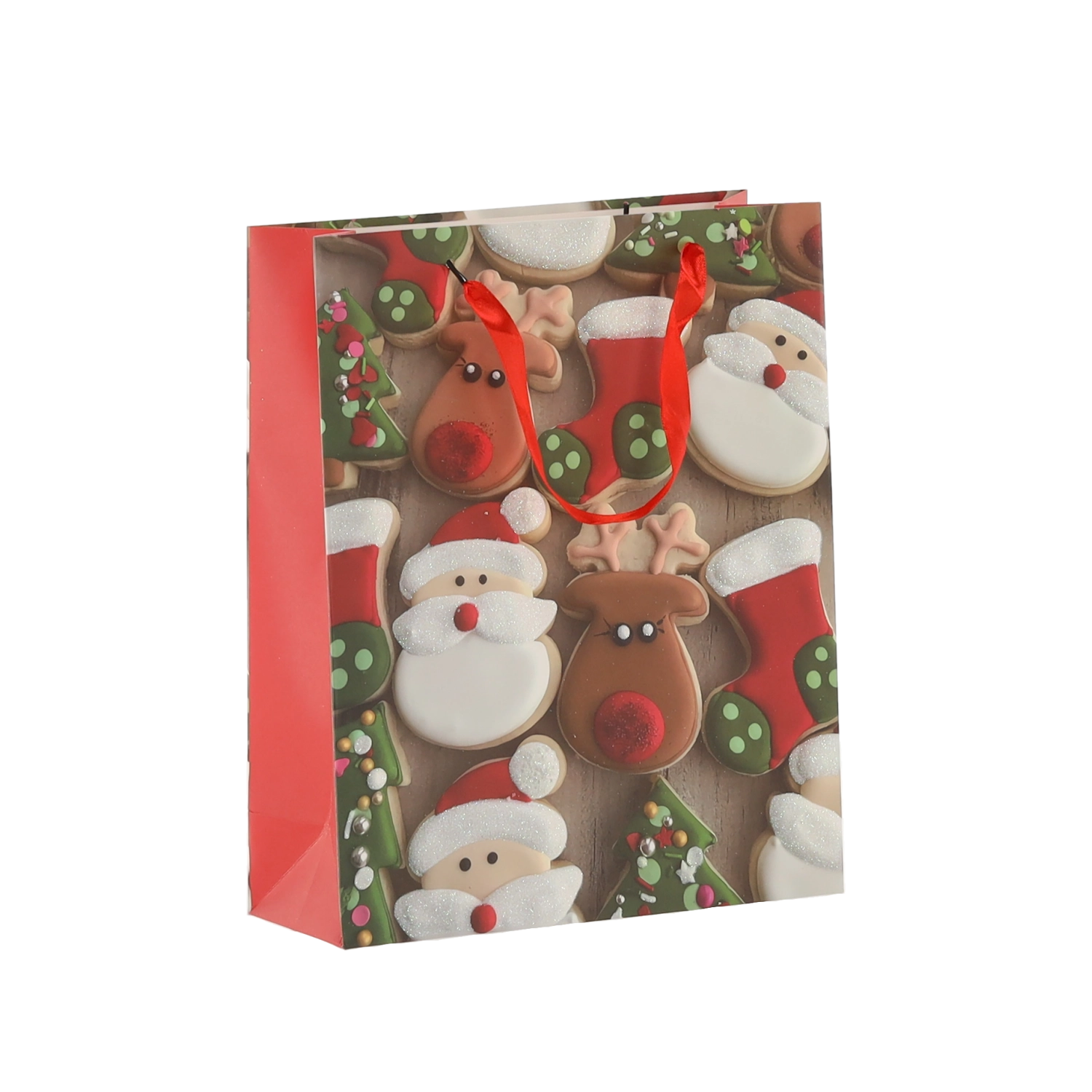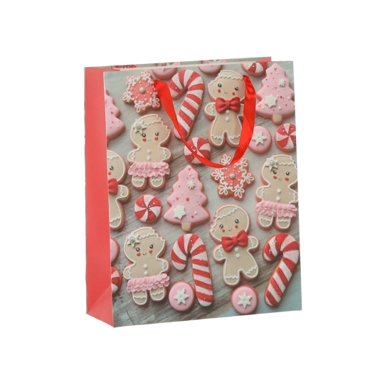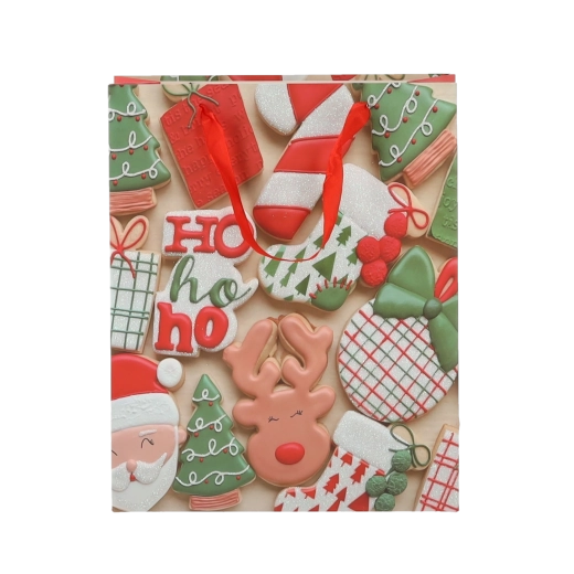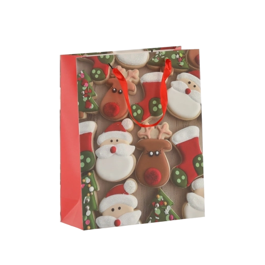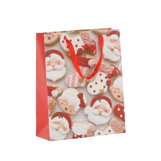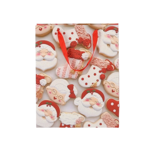 Praktičan set od 12 božićnih poklon-vrećica dimenzija 18 × 24 × 8 cm za brzo i stilsko pakiranje manjih darova. Vrećice od kvalitetnog papira gramature 157 g/m² su čvrste i izdržljive, imaju crvene trakaste ručke za ugodno nošenje i veseo tisak s motivima božićnih kolačića – Djeda Božićnjaka, sobova, drvca i rukavica. Idealne za kozmetiku, nakit i manje knjige.