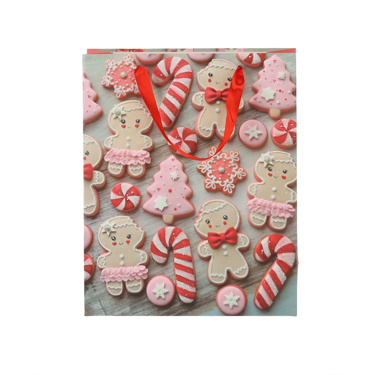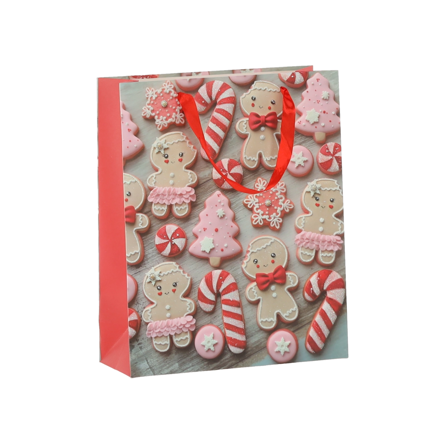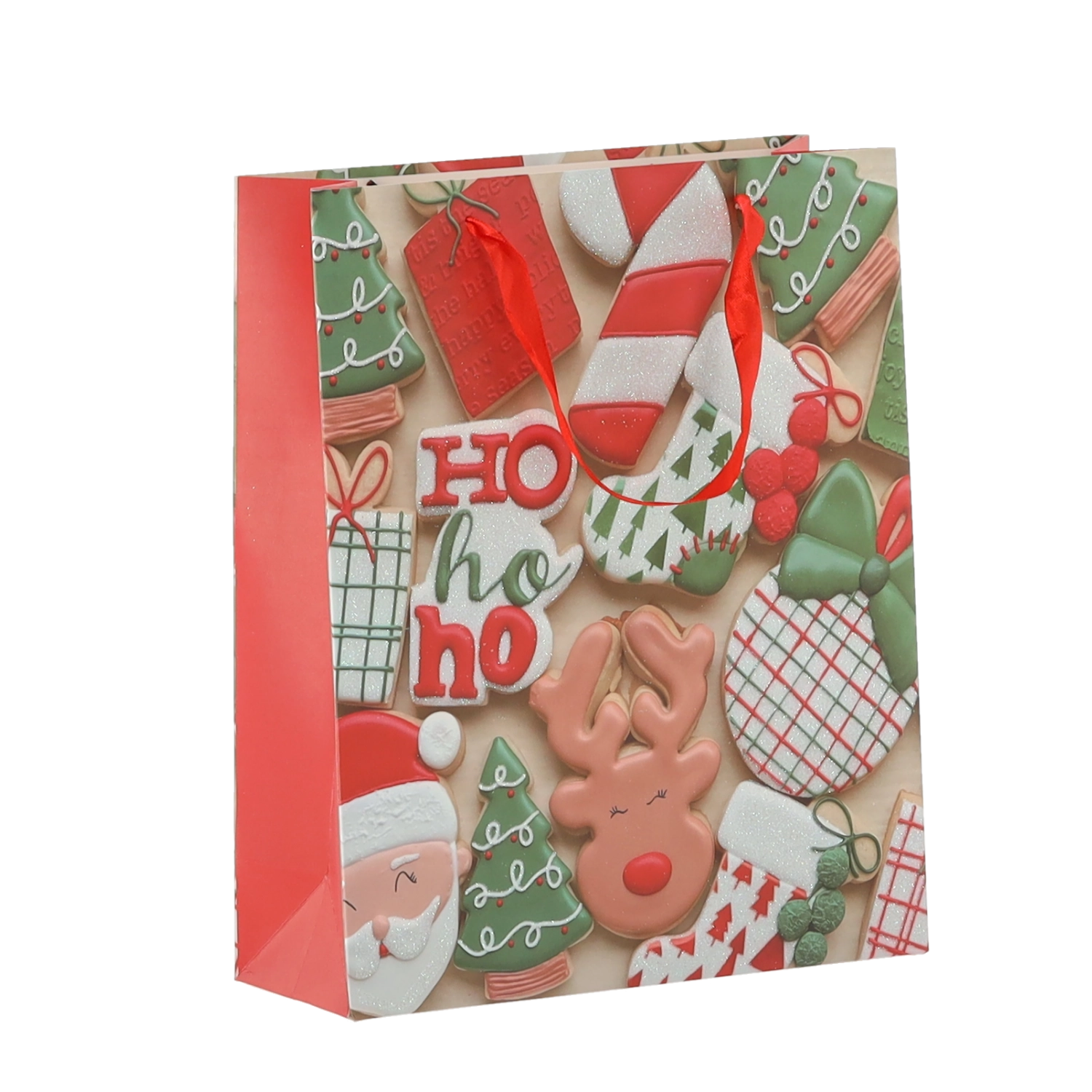 Praktičan set od 12 božićnih poklon-vrećica dimenzija 18 × 24 × 8 cm za brzo i stilsko pakiranje manjih darova. Vrećice od kvalitetnog papira gramature 157 g/m² su čvrste i izdržljive, imaju crvene trakaste ručke za ugodno nošenje i veseo tisak s motivima božićnih kolačića – Djeda Božićnjaka, sobova, drvca i rukavica. Idealne za kozmetiku, nakit i manje knjige.