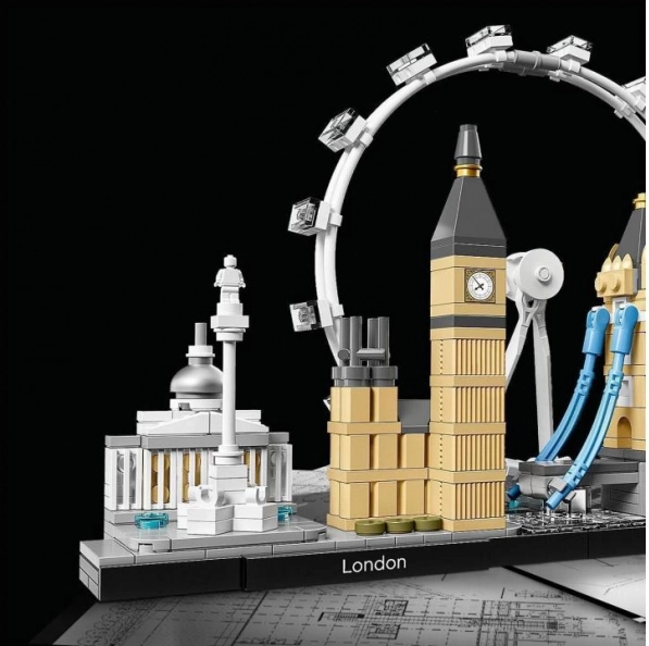 Set iz kolekcije LEGO Architecture Skyline vjerno prikazuje najpoznatije londonske znamenitosti u realističnim proporcijama i bojama. Na elegantnom postolju s ukrasnom pločicom „London” nalaze se National Gallery, Nelson’s Column, London Eye, Big Ben (Elizabeth Tower) i most Tower Bridge. Prozirni elementi u osnovi dočaravaju tok rijeke Temze, pa model izgleda sjajno iz svakog kuta.