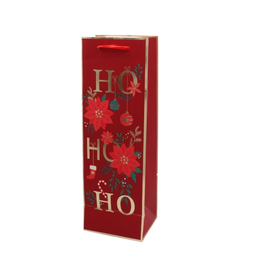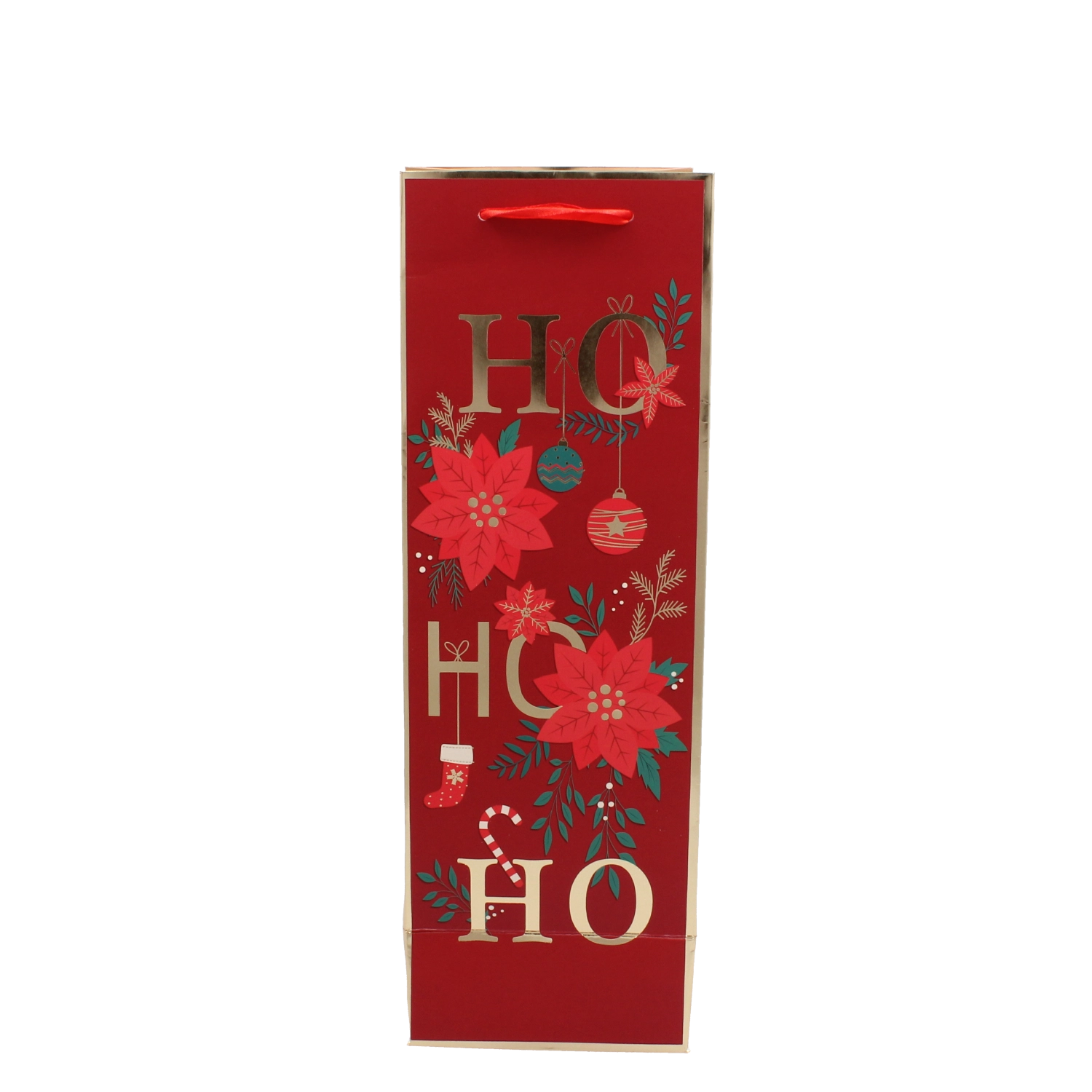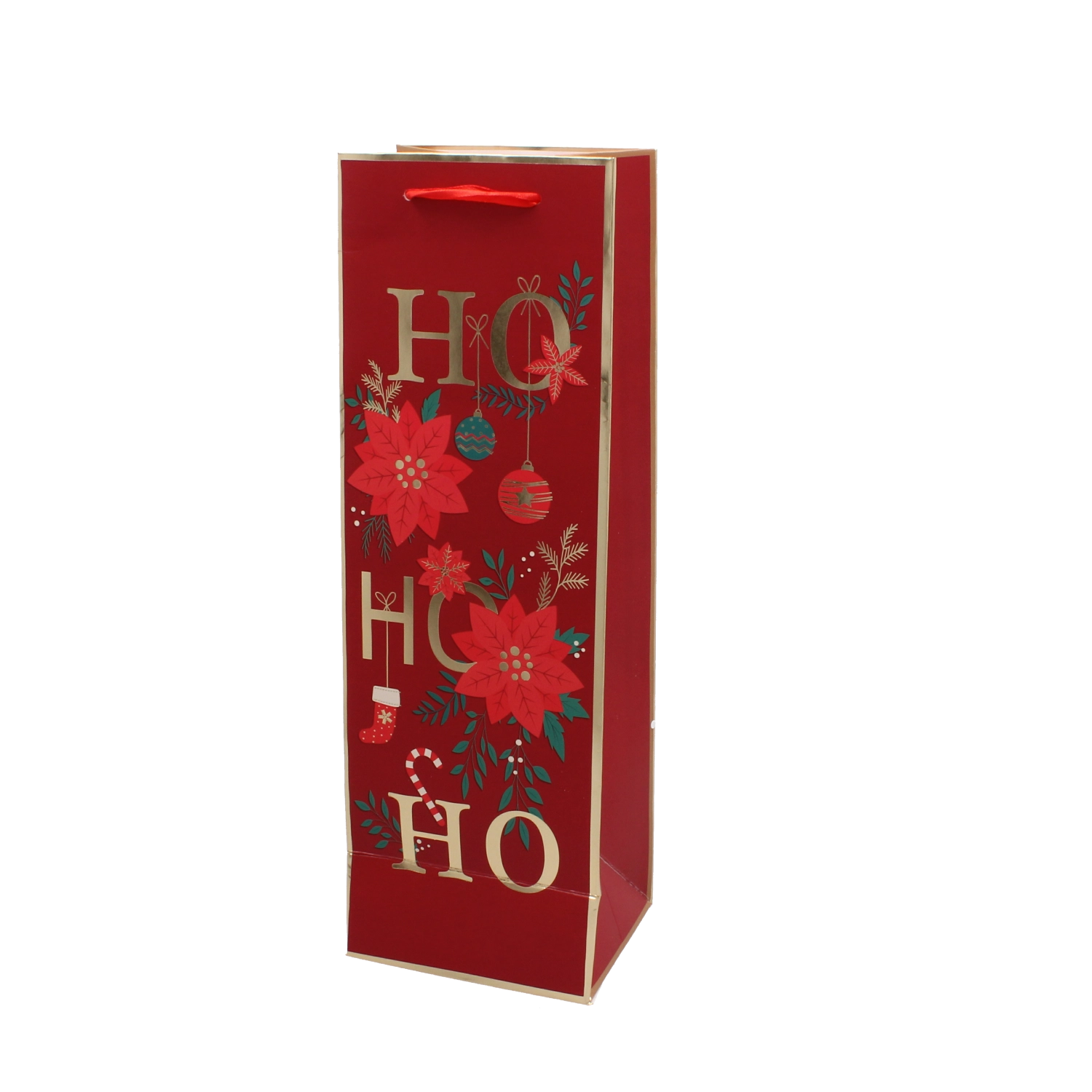 Crvena izvedba s cvjetovima, ukrasima i zlatnim natpisima Merry Christmas ili HO HO HO daje poklonu poseban izgled.