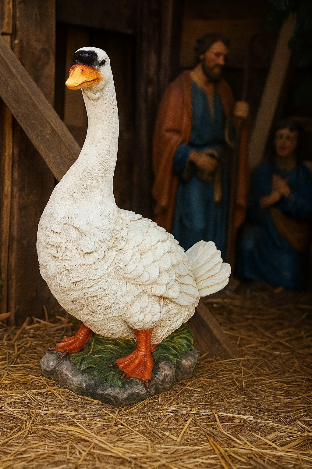 Kreirajte dojmljivu blagdansku scenu s realističnom figuricom guske 51 cm koja će odlično upotpuniti jaslice, izlog ili tematsku postavu. Precizna struktura perja, narančasti kljun i noge te prirodno postolje s motivom trave djeluju autentično i estetski čisto.