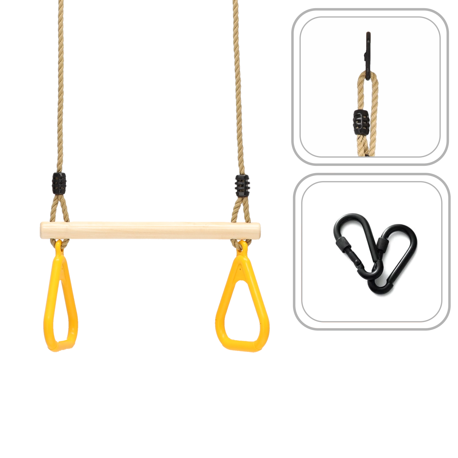 Otkrijte radost kretanja s dječjom trapeznom ljuljačkom koja spaja izdržljivost, sigurnost i bezvremenski dizajn. Poprečna drvena preča i oblikovane ručke podupiru pravilan hvat, jačaju gornji dio tijela i potiču djecu na zdravu aktivnost na svježem zraku.