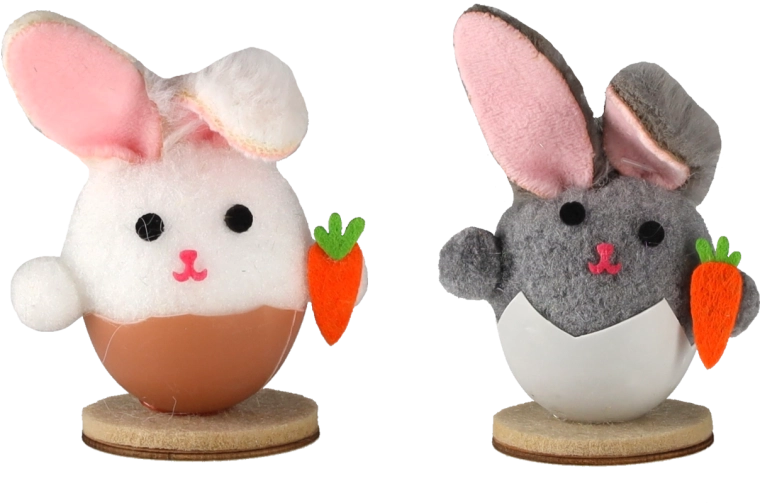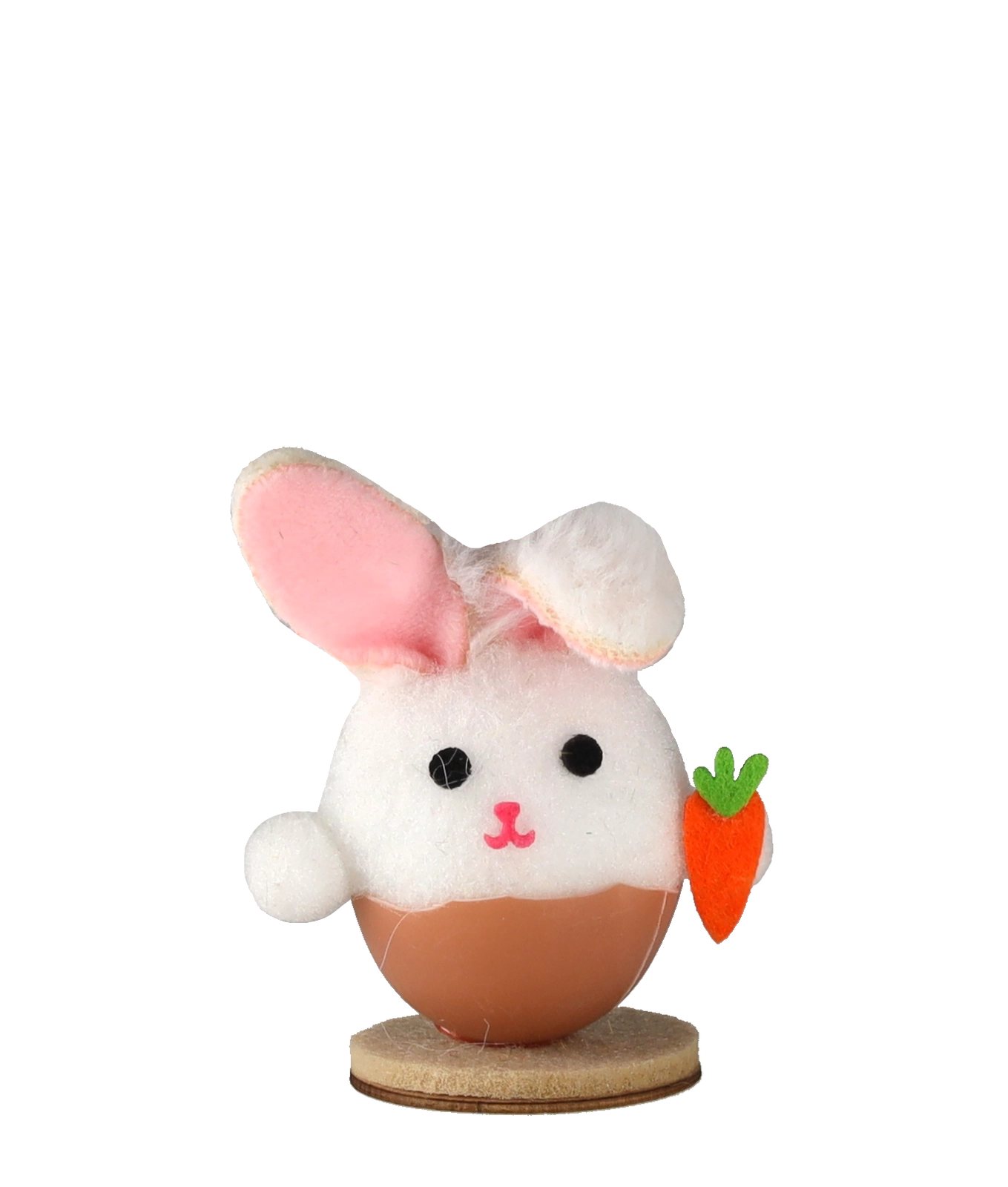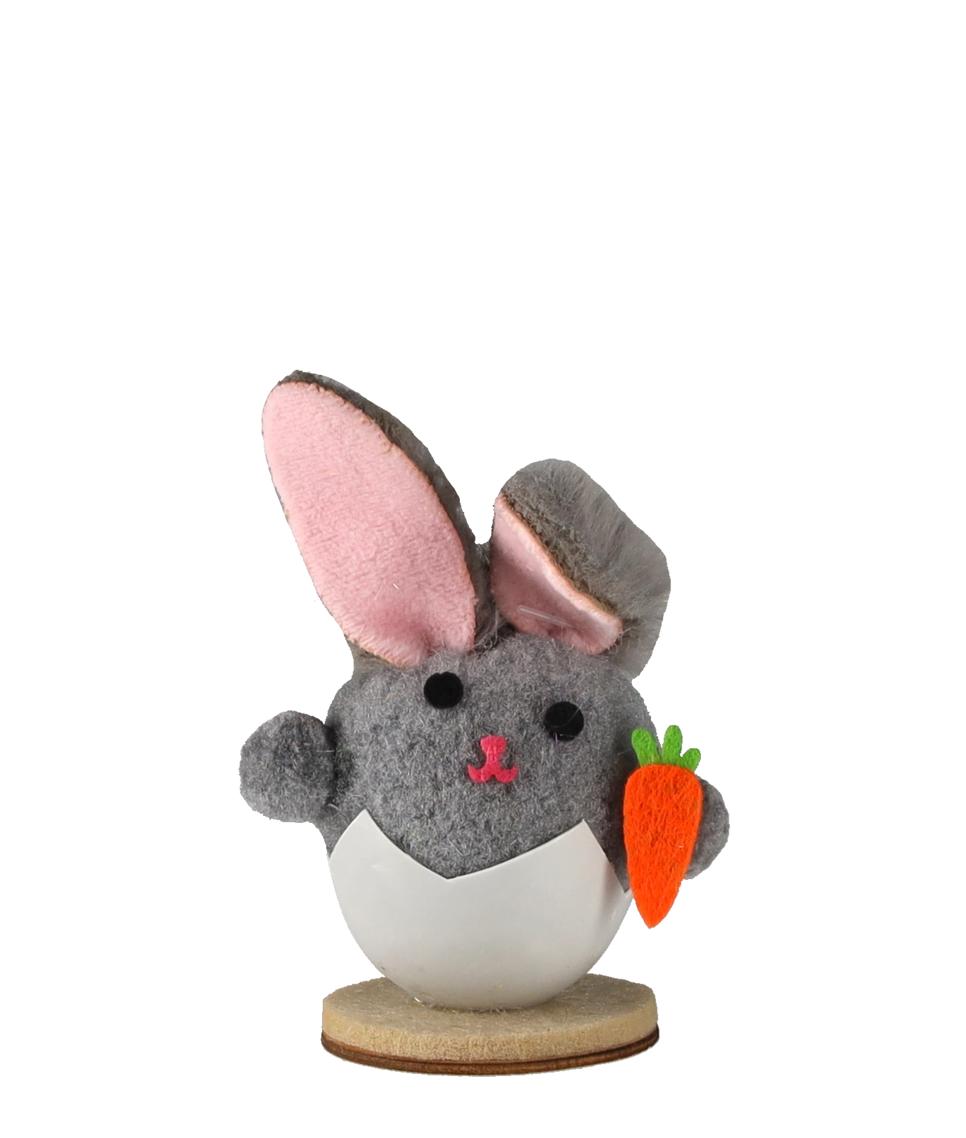 Ovaj šarmantni uskrsni ukras prikazuje zekana koji proviruje iz ljuske jajeta – simbola novog života i proljeća. Nježne boje, mekana tekstilna površina i realistični detalji (njuškica, uši, mrkvica) čine ga očaravajućim dodatkom svakom interijeru.