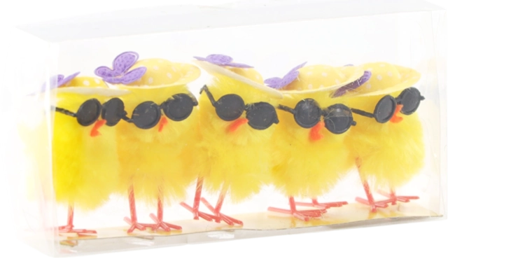 Set od pet uskrsnih ukrasa u obliku pilića sa sunčanim naočalama i kontrastnim detaljima unosi u interijer veselu, svježu atmosferu. Laka plastika s paperjastim efektom djeluje razigrano na pogled i dodir, a istodobno je izdržljiva za višekratnu upotrebu.