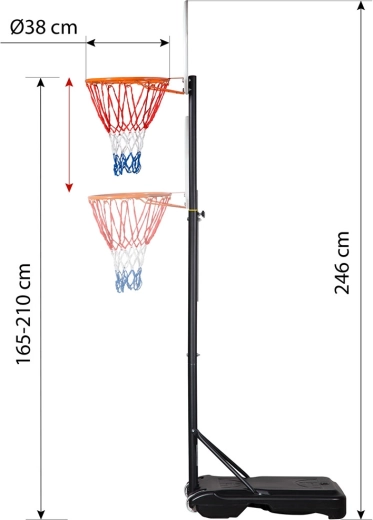 Zahvaljujući bazi zapremnine 28 litara (voda/pijesak) i integriranim kotačićima dobivate stabilnost i punu mobilnost. Regulacija visine u četiri koraka po 11,5 cm omogućuje prilagodbu koša trenutačnim potrebama igrača i trenažnim ciljevima.