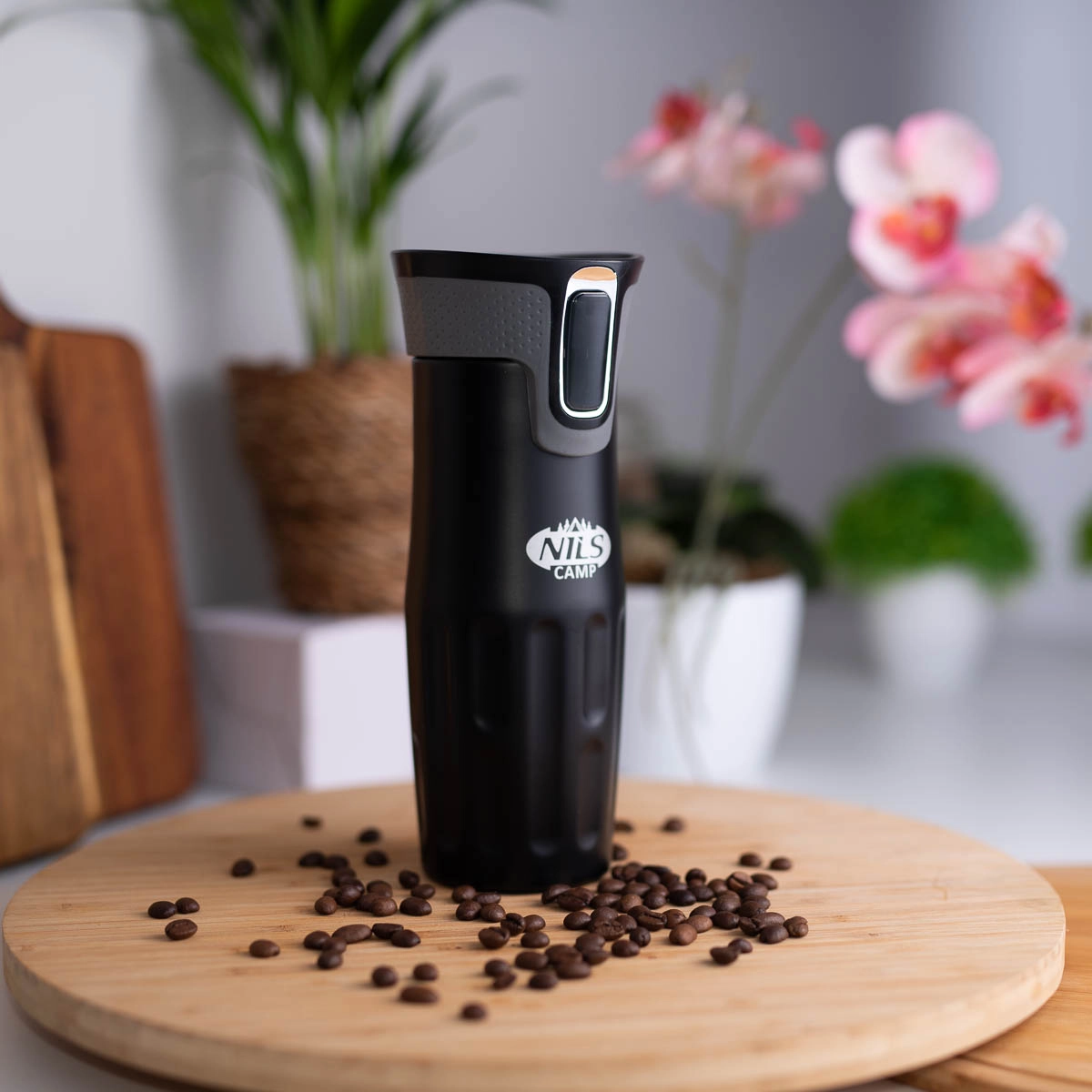 Praktični poklopac na gumb omogućuje brzo otvaranje jednim pritiskom i automatsko zatvaranje nakon otpuštanja, pa se smanjuje rizik od prolijevanja. Protuklizna gumena baza povećava stabilnost na glatkim površinama i štiti od nepoželjnih nezgoda s vrućim napicima.