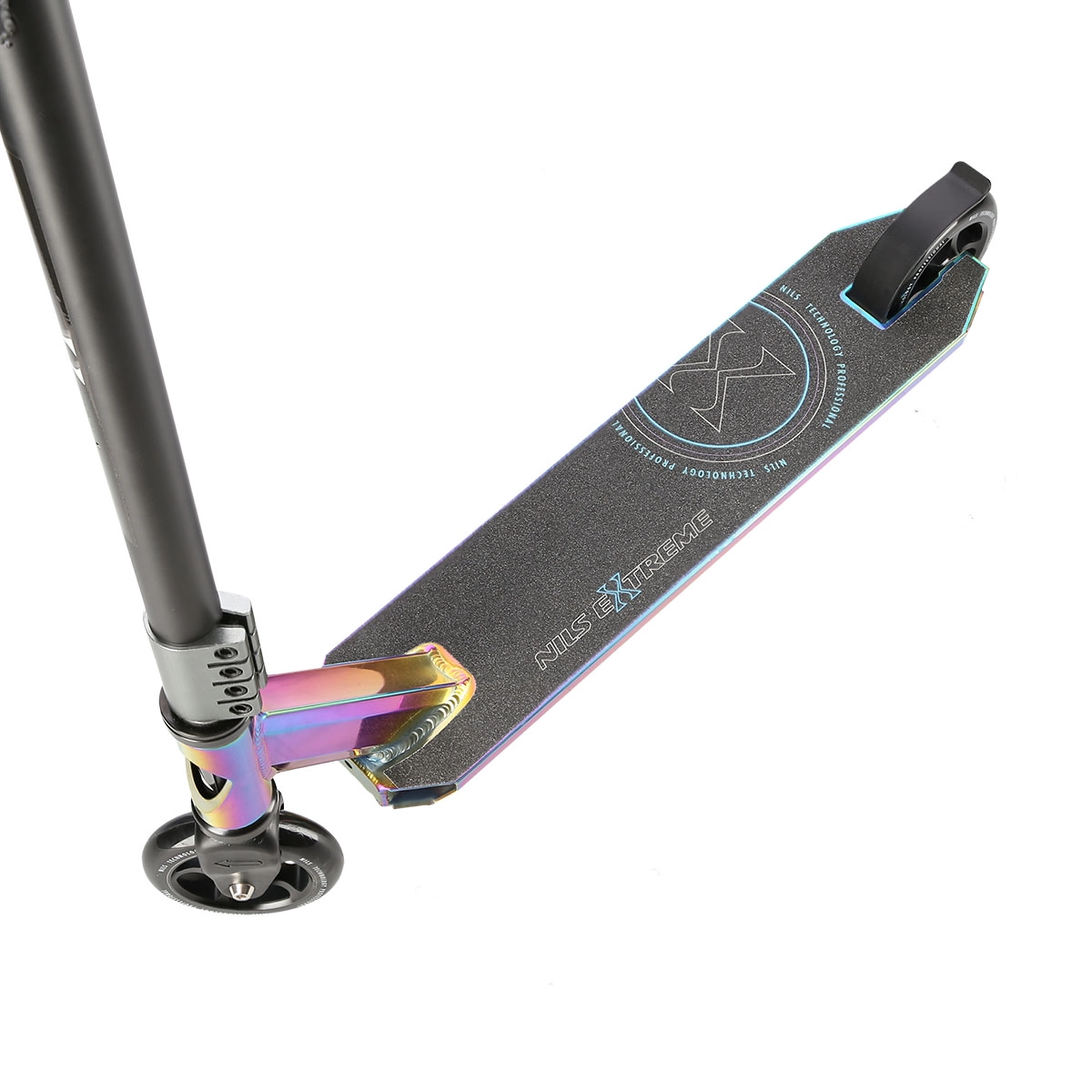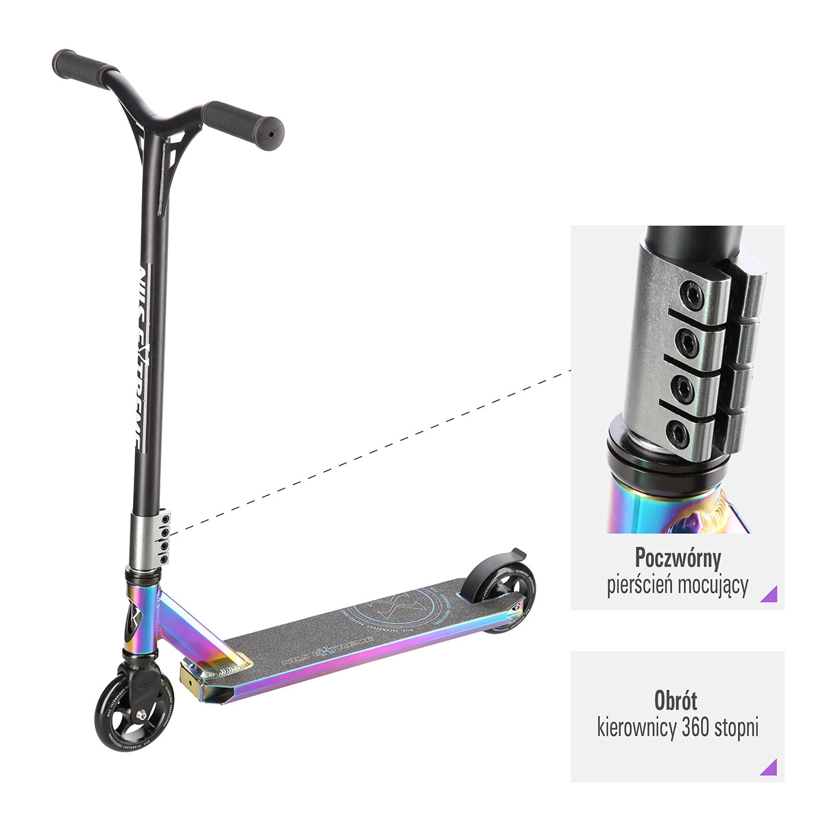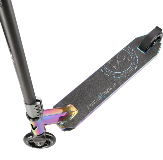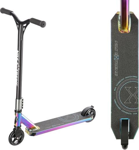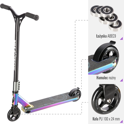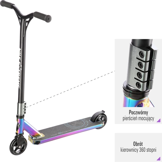 NILS Extreme HS109 neon idealan je izbor za vozače koji žele podići svoje trikove na višu razinu. Zahvaljujući čvrstoj čeličnoj vilici, stezaljci s 4 vijka i robustnoj platformi s dvije prečke i tri komore osigurava visoku stabilnost i pri zahtjevnijim skokovima. Gumene grip ručke učinkovito prigušuju vibracije i povećavaju udobnost pri vožnji.