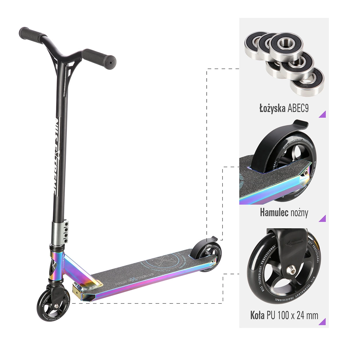 Mali i brzi PU kotači 100 x 24 mm s preciznim ležajevima ABEC 9 donose živahnu akceleraciju i glatku vožnju. Volan s rotacijom 360° omogućuje neograničene kombinacije trikova, dok stražnja pritisna (blatobranska) kočnica pruža sigurno i promptno kočenje.