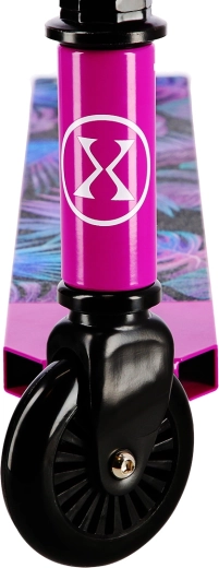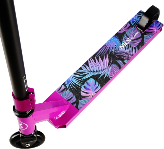 Tražite pouzdan romobil za skatepark i ulice? Ovaj model marke NILS Extreme s motivom Leaves temelji se na čvrstom trokomornom aluminijskom decku i širokom bezzavojnom upravljaču, koji je stegnut trostupanjskom stegom za maksimalnu krutost. Odsutnost sklopivog mehanizma i podešavanja visine jamči veću izdržljivost cijele konstrukcije pri izvođenju trikova.