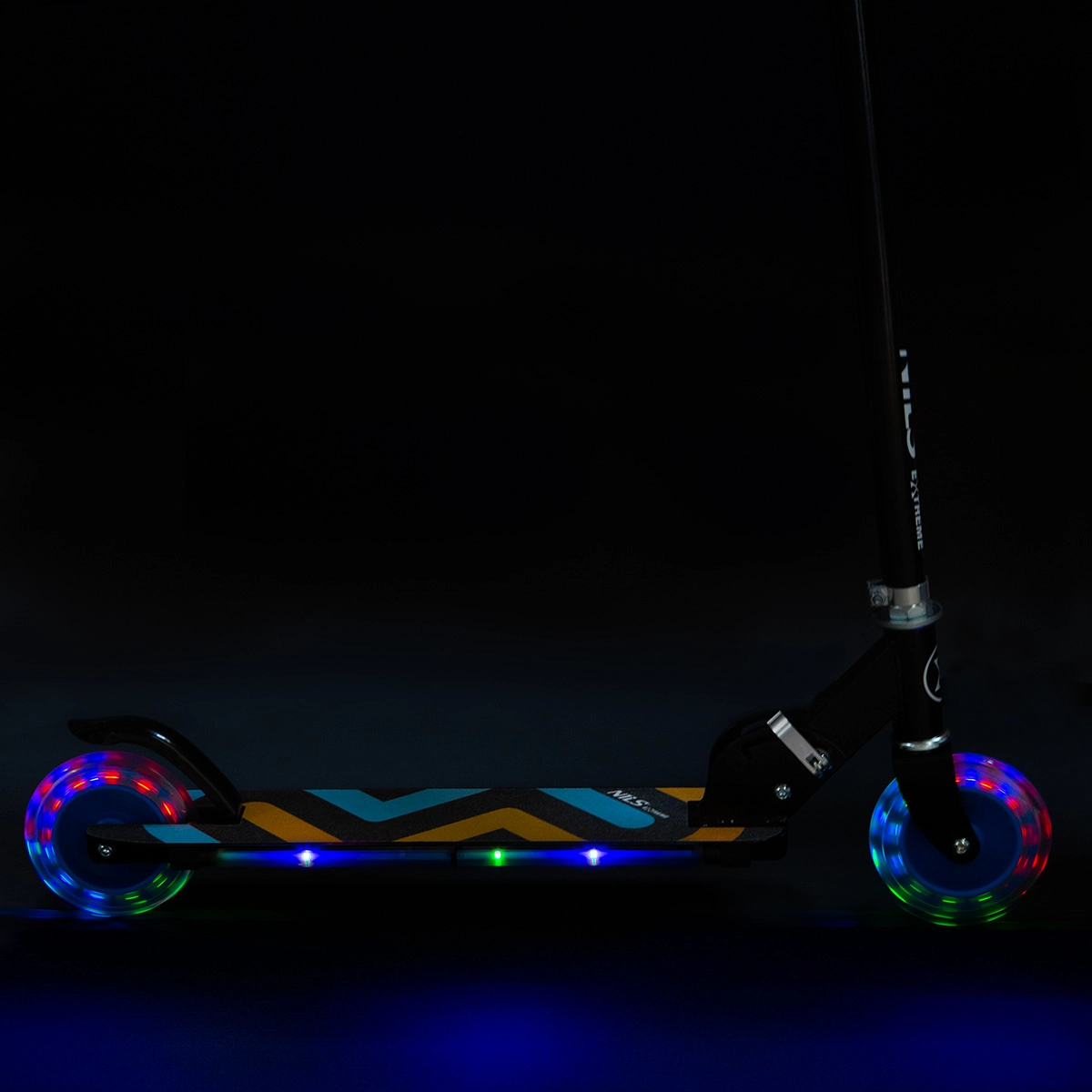 Šarene LED diode u kotačima promjera 125 mm automatski svijetle tijekom vožnje, a bočne stranice stajališta nadopunjuje efektno LED osvjetljenje (napajanje 3× AAA, nisu uključene). Djeca će biti vidljivija i u sumrak.