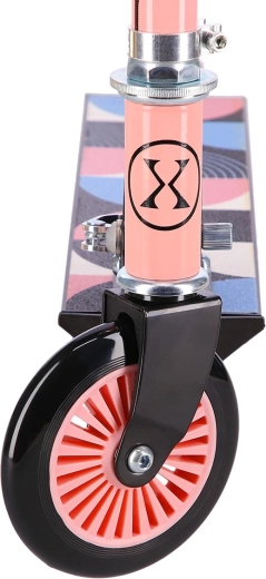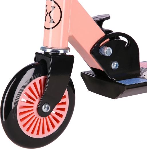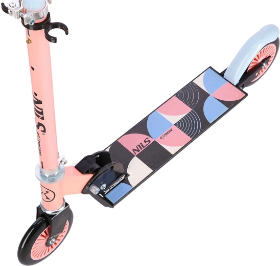 Romobil NILS Extreme u ružičasto‑plavoj boji spaja čvrstu čeličnu konstrukciju s olakšanom aluminijskom daskom za stabilnu i udobnu vožnju po asfaltu i utvrđenim pločnicima. Poliuretanski kotači promjera 125 mm s ležajevima ABEC 5 osiguravaju glatko kotrljanje i sigurnost pri svakodnevnom putovanju.