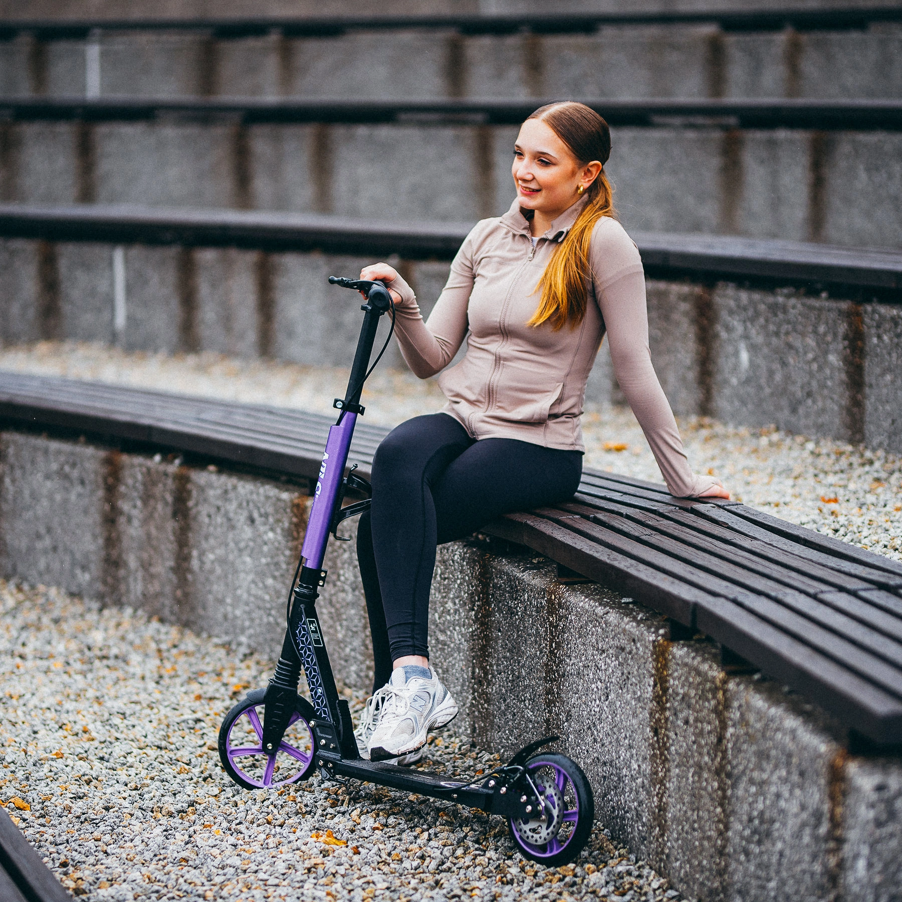 Za maksimalnu sigurnost roler je opremljen stražnjom disk kočnicom koja pruža snažan i dobro dozirljiv kočioni učinak. Podesiva visina upravljača 93–110 cm pristaje vozačima različite visine, dok nizak oslonac za stopalo olakšava odraz i održavanje ravnoteže. Brzo sklapanje i integrirano postolje čine ga praktičnim suputnikom na putu i do škole.