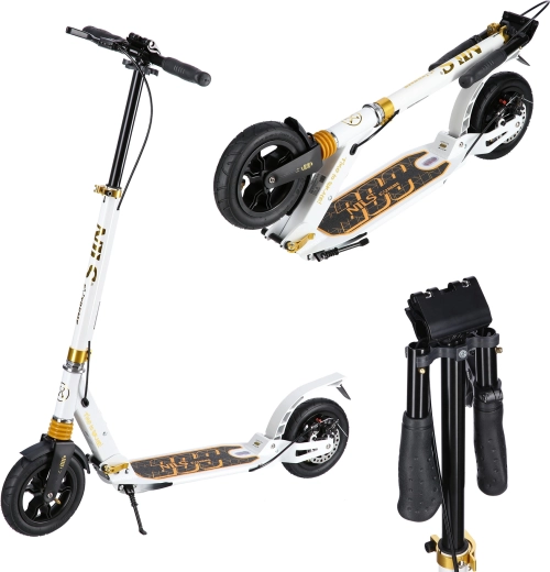 O vašu sigurnost brinu stražnja disk i nožna kočnica te reflektori za bolju vidljivost. Podesiva upravljačka šipka (89–104 cm) i ergonomske gumene ručke pružaju udobnost vozačima različitih visina. Zahvaljujući brzom sklopivom mehanizmu, kompaktnim dimenzijama nakon sklapanja i odvojivom ramenom remenu prenošenje i skladištenje pitanje je trenutka.