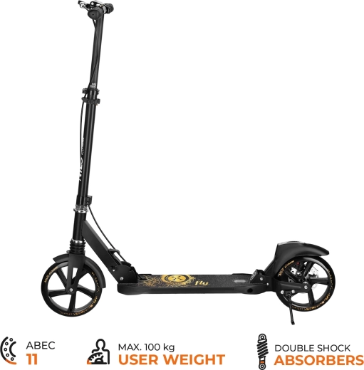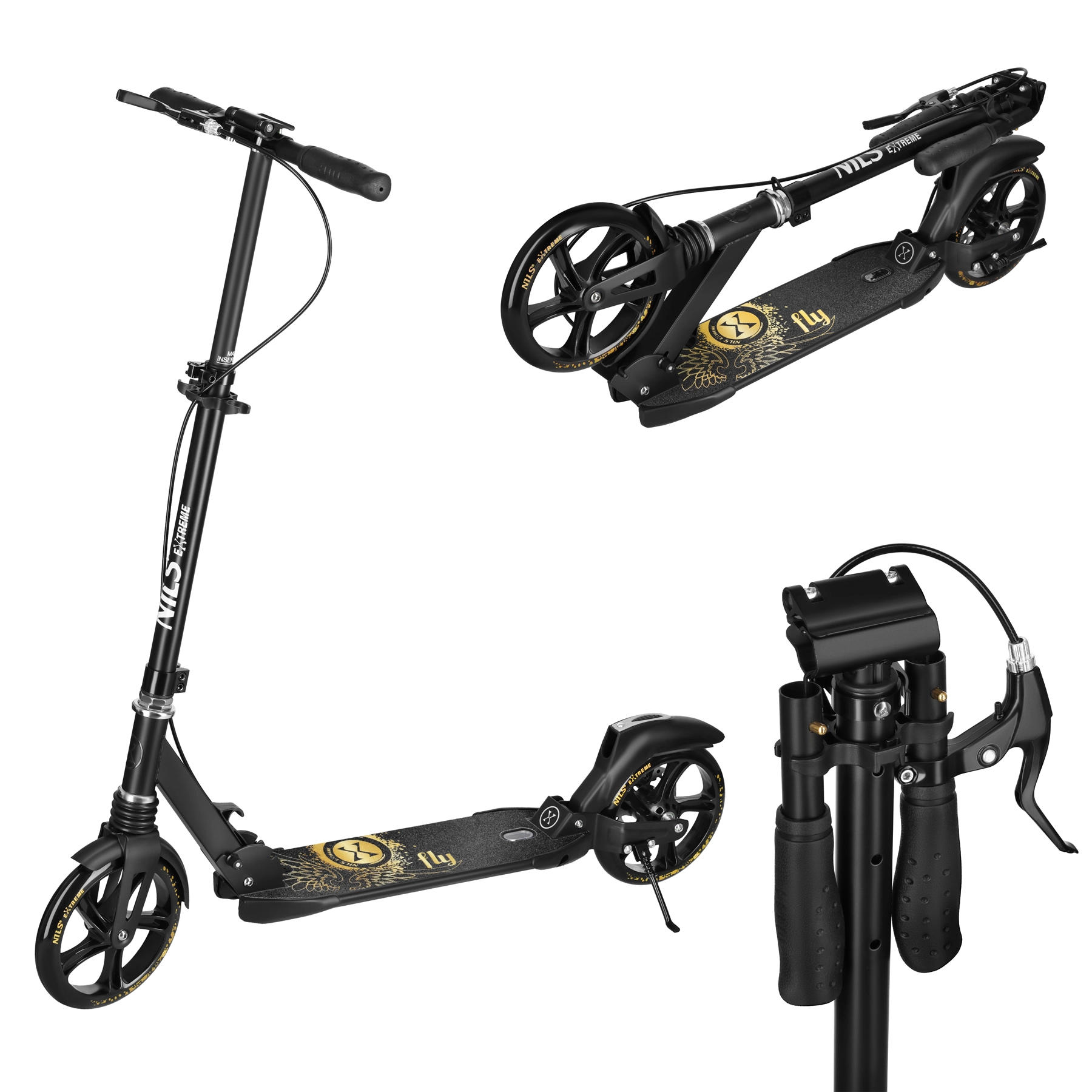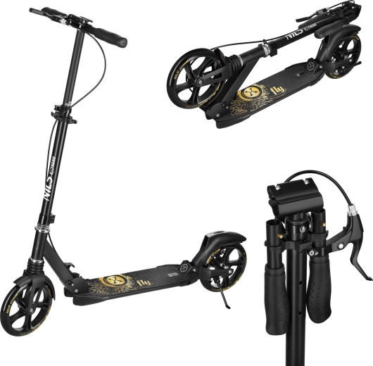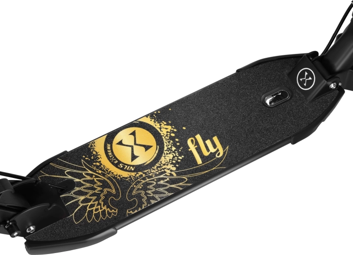 Romobil NILS Extreme Fly odličan je izbor za gradsko putovanje i rekreativnu vožnju. Veliki 200 mm PU kotači i precizni ležajevi ABEC-11 osiguravaju gladak hod na asfaltu, kaldrmi i pločnicima, dok kombinacija čelika i aluminija daje čvrstoću bez nepotrebne mase. Elegantan zlatni akcent i moderna grafika oduševit će sve koji cijene stil i funkcionalnost.