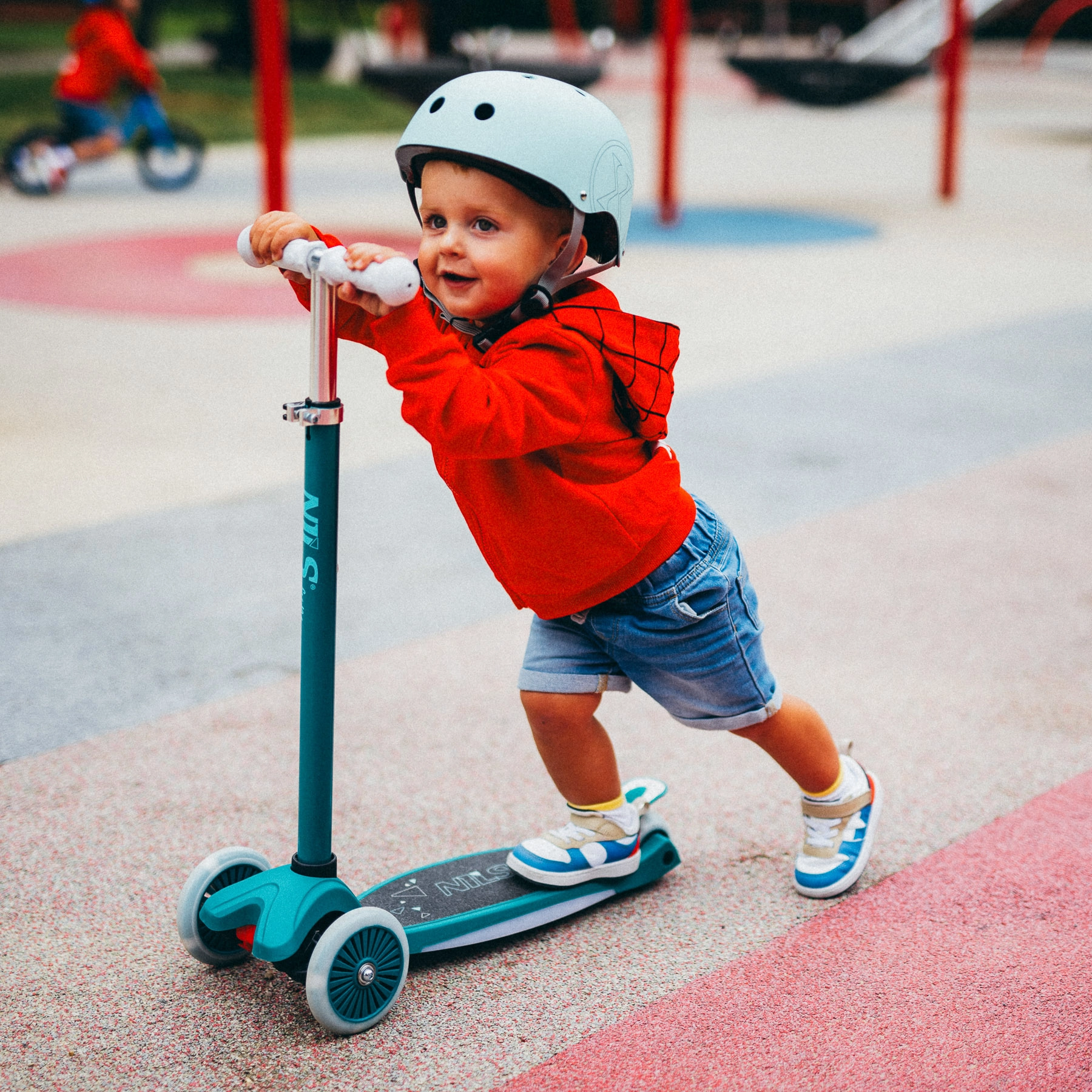 Dva prednja kotača i nagibno upravljanje pomažu djeci sigurno skretati bez pretjeranog okretanja upravljača. Široka daska i stražnja kočnica povećavaju kontrolu tijekom vožnje.