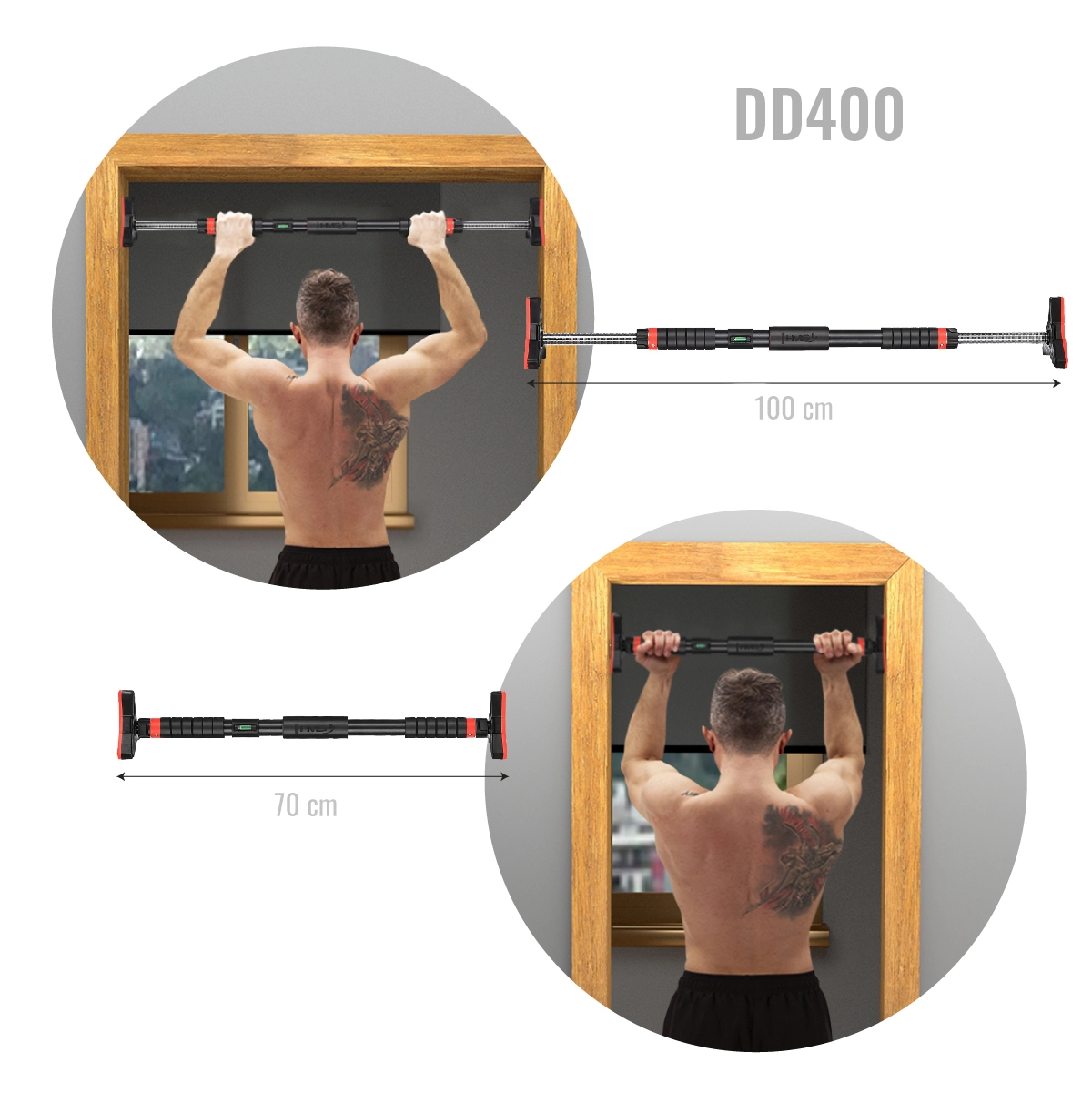 Prošireni, trokutasti završeci s NBR slojem ravnomjerno raspoređuju pritisak na dovratnik, čvrsto ostaju na mjestu i povećavaju sigurnost – čak i pri naglom otpuštanju ukose se u dovratnik i sprječavaju pad. Neprijelazno podesiva duljina 70–106 cm omogućuje optimalno smještanje u većinu dovratnika. Šipka je idealna za zgibove, povlačenja, sklekove, dipove i potiske na različitim visinama.