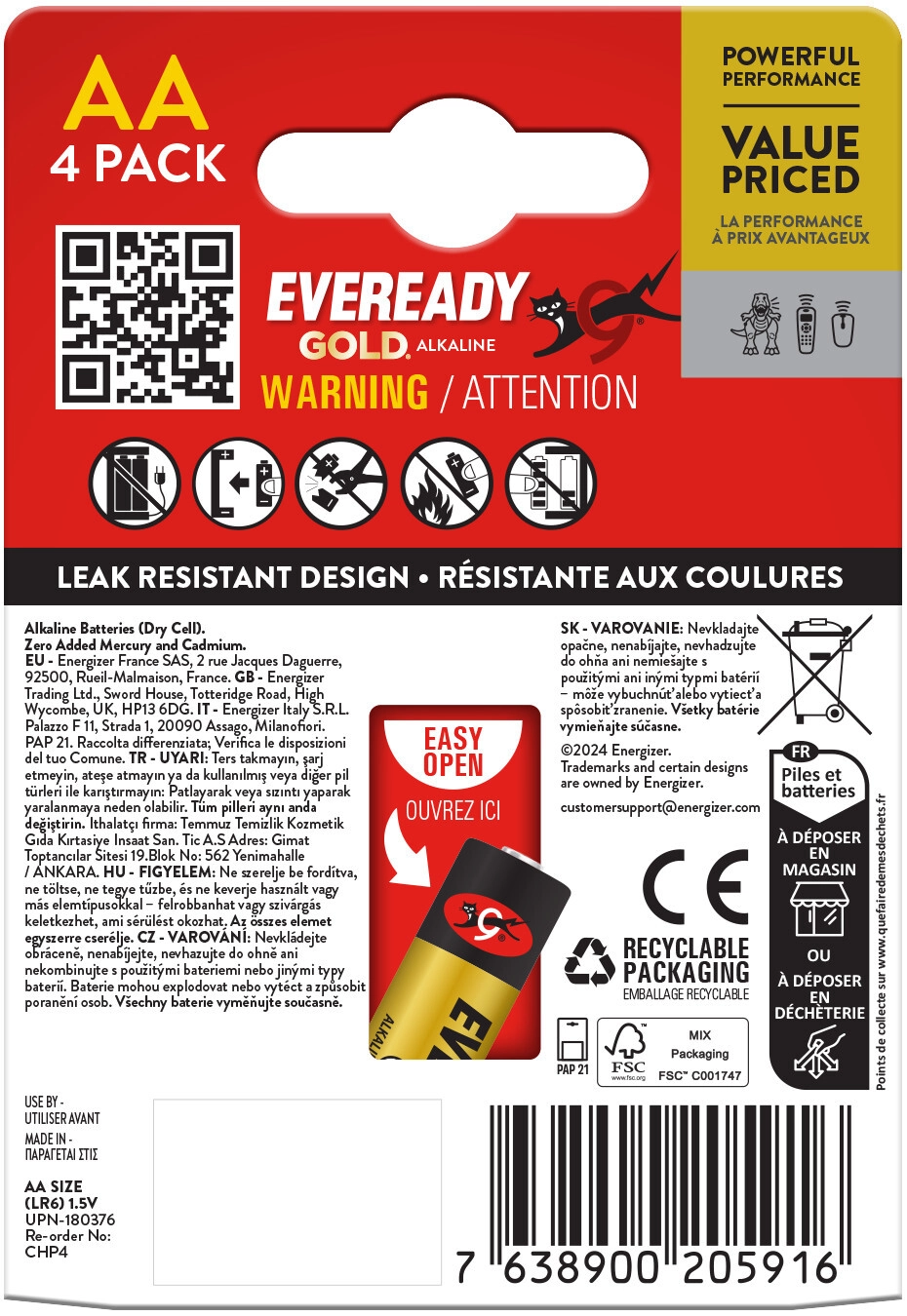 Tražite univerzalno napajanje za kućnu elektroniku? ENERGIZER Eveready Gold veličine AA su alkalne baterije dizajnirane za pouzdan rad uređaja s normalnom do srednjom potrošnjom. Pružaju dugotrajnu energiju i niže samopražnjenje u odnosu na cink-ugljične alternative.
