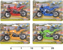 Malen, ali brz! Ovaj trkaći motocikl dužine 11 cm oduševit će svakog ljubitelja brzine. Zahvaljujući slobodnim kotačima lako i glatko vozi po podu te je idealan za dječje utrke i kućnu kolekciju. Dostupan u 4 vesele boje – plava, zelena, crvena i žuta.