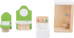 Stilizirani set kupaonskog namještaja za kućicu za lutke razveselit će sve male graditelje. Sadrži tuš-kabinu, kadu, umivaonik sa zrcalom i WC u ugodnoj kombinaciji zelene i prirodnog drva. Izrađen je od masivnog drva za dugotrajnost i sigurnu igru. Podržava maštu i finu motoriku te je prikladan za savitljive lutke do 12 cm.