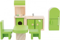 Ovaj detaljno izrađen kuhinjski set za kućice nudi sve što mali kuhari trebaju – sudoper, štednjak, hladnjak, stol i dvije stolice u ugodnoj kombinaciji prirodnog drva i svježih zelenih akcenata. Zahvaljujući masivnom drvu, namještaj je stabilan i spreman za svakodnevnu igru.
