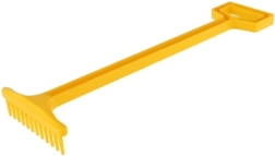 Duga ručka i profilirani kraj osiguravaju stabilno držanje pri grabljenju pijeska i lišća.