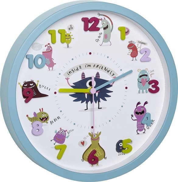 Veseli dječji zidni sat TFA Little Monsters s tirkiznim brojčanikom i reljefnim 3D brojkama olakšava djeci učenje vremena. Svaki sat prati vlastito čudovište koje na razigran način potiče planiranje dana. Sat ima tih rad, žive boje i oznake minuta za lako čitanje u dječjoj sobi ili vrtiću.