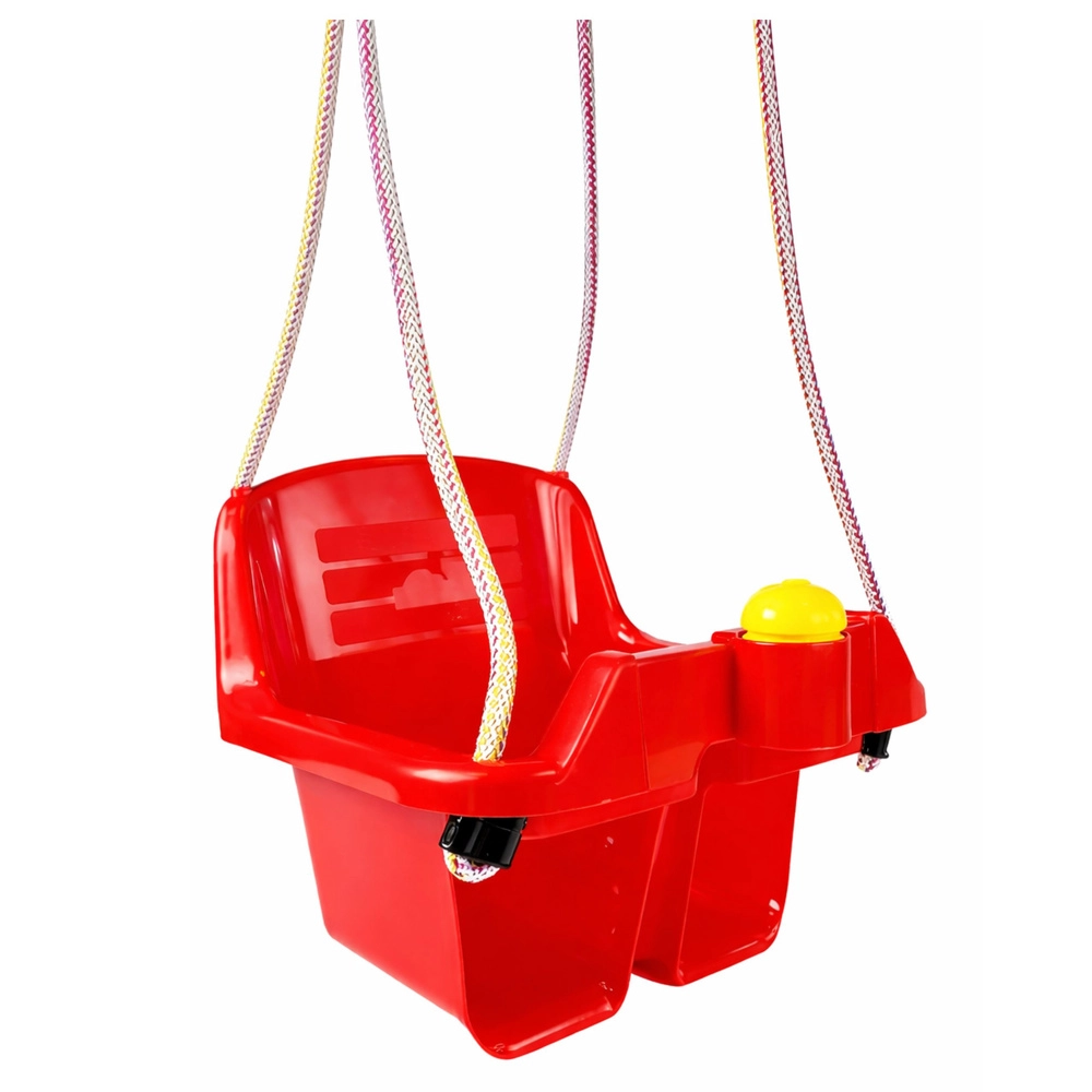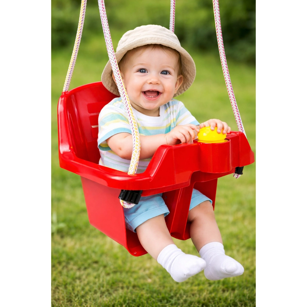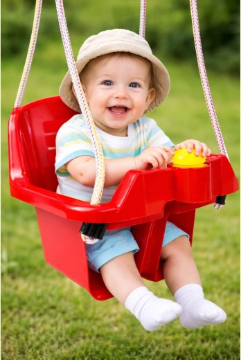 Sigurna crvena kiblasta ljuljačka za najmlađe s visokim naslonom, prednjom pregradom i čvrstim ovjesom. Nudi duboko sjedalo, stabilnu potporu leđima i izdržljivu plastiku pogodnu za vrt i interijer. U kompletu je i zabavni klakson koji će razveseliti svaku bebu.