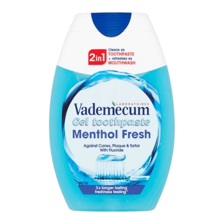 Vademecum 2u1 Menthol Fresh spaja učinke paste za zube i vodice za ispiranje usta u jednom proizvodu. Dovoljno je pomiješati s vodom i u trenu ćete stvoriti učinkovitu vodicu za usta koja pomaže uklanjati bakterije, osvježava dah i podupire zdrav izgled desni. Zahvaljujući mentolnoj svježini pruža čak tri puta duži osjećaj svježine.