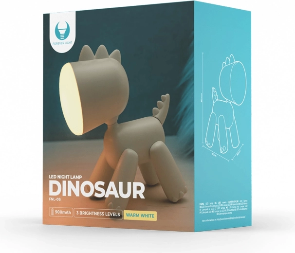Bežična dječja LED lampa Forever FNL-08 Dinosaur donosi toplo svjetlo, 3 razine svjetline i podesiv kut osvjetljenja. Zahvaljujući bateriji od 900 mAh i punjenju putem USB-C priključka, idealna je kao noćno svjetlo i kao stolna lampica za čitanje. Izdržljivo kućište od ABS-a i intuitivna sklopka na stražnjoj strani osiguravaju sigurno i udobno korištenje za djecu.