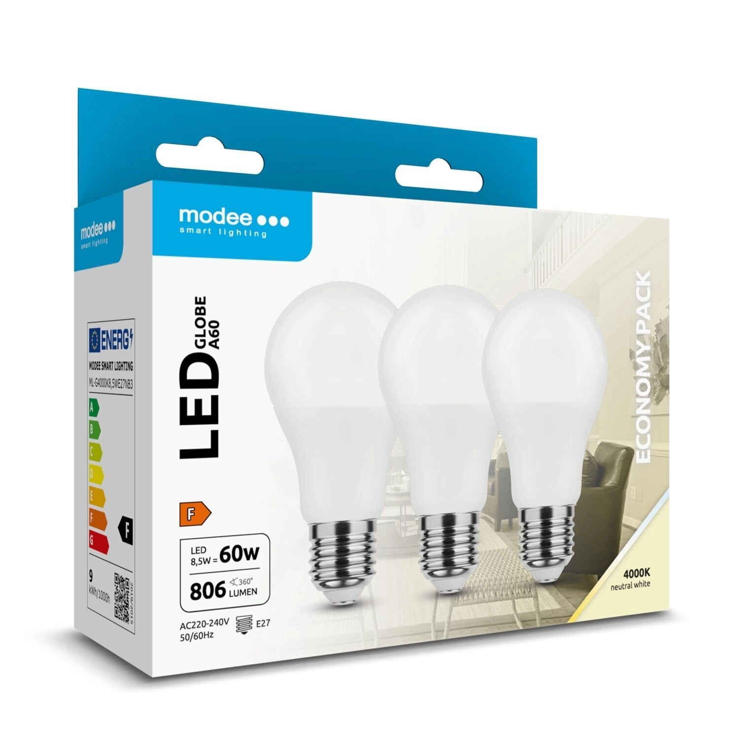 LED žarulja Modee Globe A60 kombinira visoku energetsku učinkovitost i pouzdanost. Neutralno bijela boja svjetla 4000 K izvrsna je za rad, čitanje i svakodnevne aktivnosti jer vjerno prikazuje boje (CRI > 80) i ne zamara oči. Široki kut osvjetljenja 270° ravnomjerno obasjava prostor bez oštrih sjena.