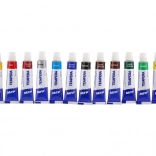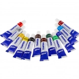 Set sadrži izbor 12 popularnih nijansi u tubama od 12 ml: svijetloplava i tamnoplava, svijetlozelena i tamnozelena, svijetložuta i tamnožuta, svijetlocrvena i tamnocrvena, svijetlosmeđa i tamnosmeđa, bijela i crna. Aluminijske tube s navojnim čepom omogućuju precizno doziranje i štite boju od isušivanja.