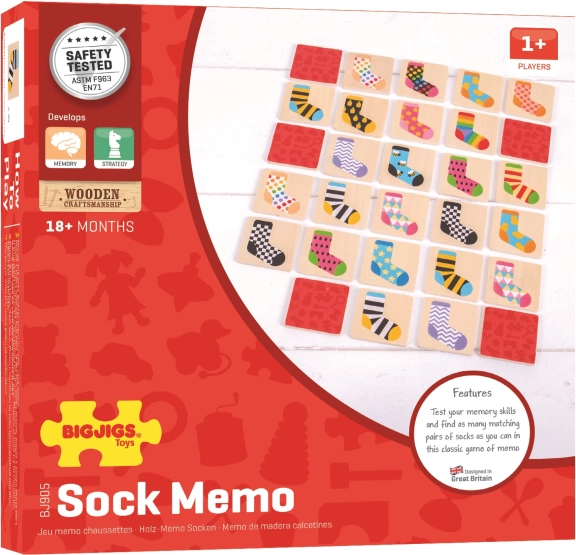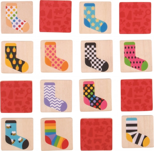 Obogatite vrijeme igre s djecom uz drveno pexeso s čarapama. Ova igra stimulira pamćenje i podržava koncentraciju i razvoj strateških vještina. Sve što vam treba je rasporediti 32 drvena igraća dijela licem prema dolje i početi otkrivati po dva istovremeno. Poteškoća postupno raste, a igrači nastoje povezati parove čarapa i usvajati nove strategije.