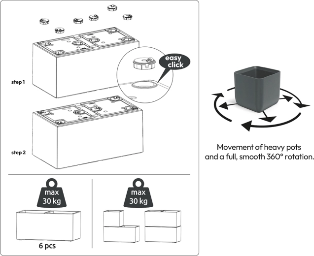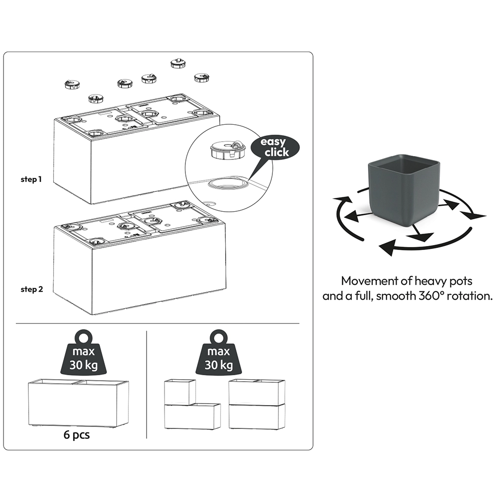 Integrirani samonavodnjavajući sustav održava idealnu vlažnost supstrata, pa biljke napreduju i uz rjeđe zalijevanje. Nožice s imitacijom drva osiguravaju stabilnost, bolje prozračivanje dna i elegantan izgled kako na terasi, tako i u dnevnom boravku.