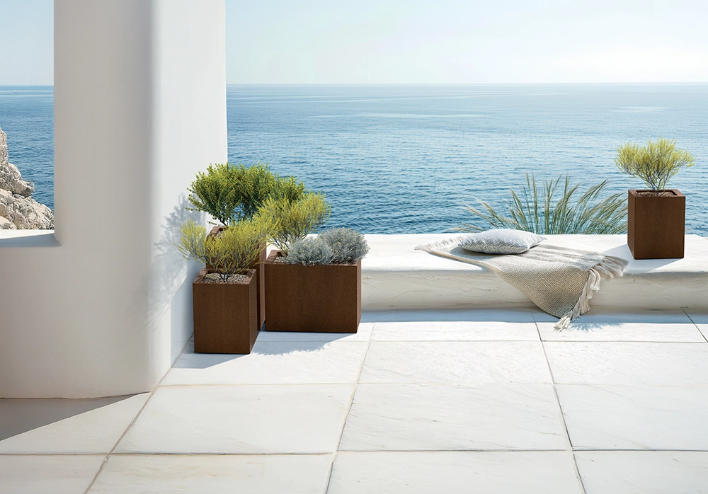 Minimalistički kvadratni oblik u zahrđalo smeđem tonu lijepo se slaže s prirodnim materijalima i naglašava zelenilo na balkonu, terasi i u dnevnoj sobi.