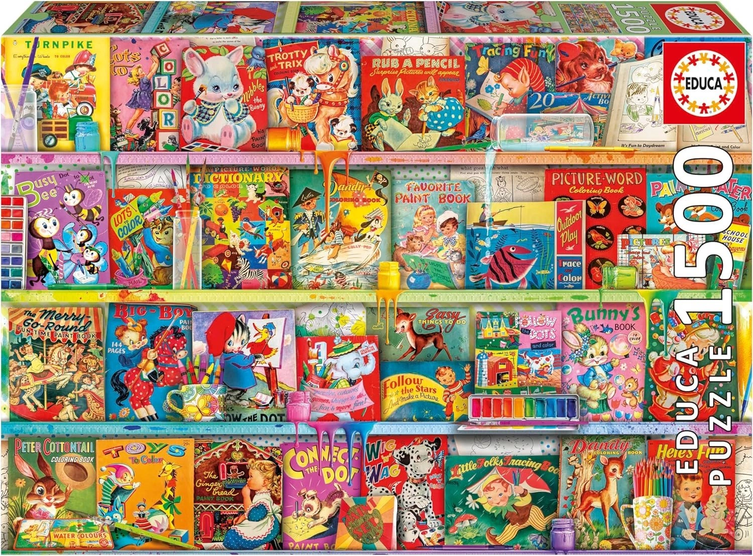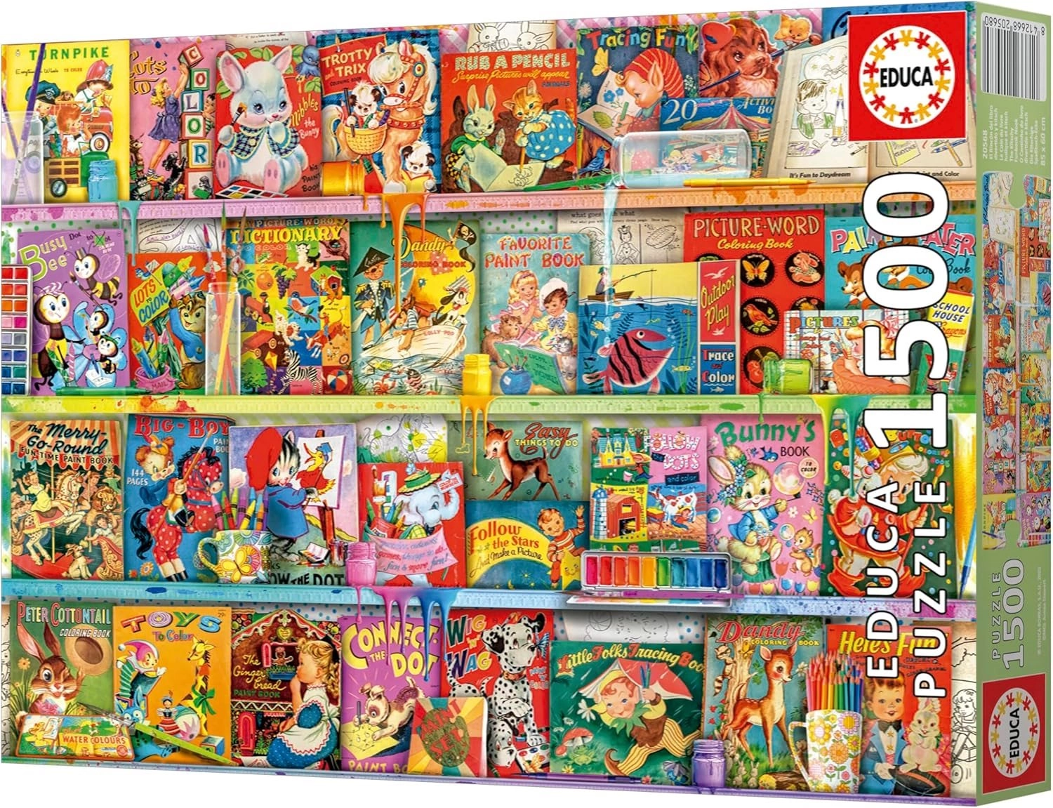Otkrijte radost slaganja s puzzle EDUCA od 1500 dijelova s motivom kičasto zabavnog knjižnog kutka. U pakiranju se nalazi besplatno ljepilo za jednostavno fiksiranje gotove slike dimenzija otprilike 85 × 60 cm. Idealno za ljubitelje knjiga koji žele uživati u kvalitetnoj izradi i izražajnim bojama tijekom dugih trenutaka opuštanja.