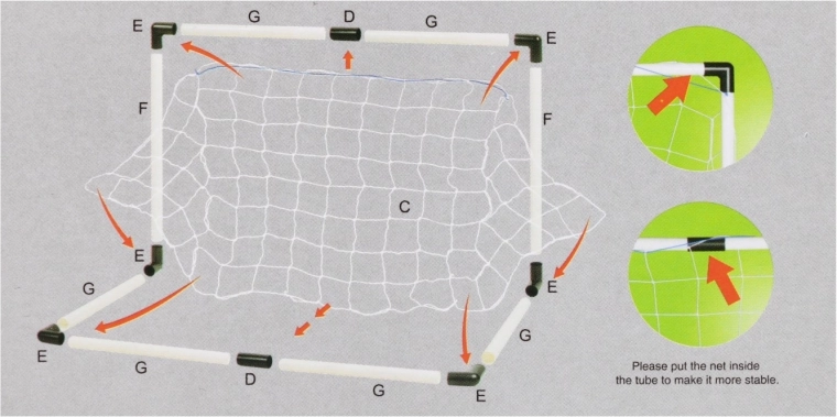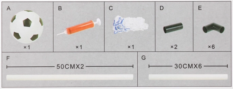 - Okvir gola (cijevi i kutni spojevi), mreža, lopta, ručna pumpica