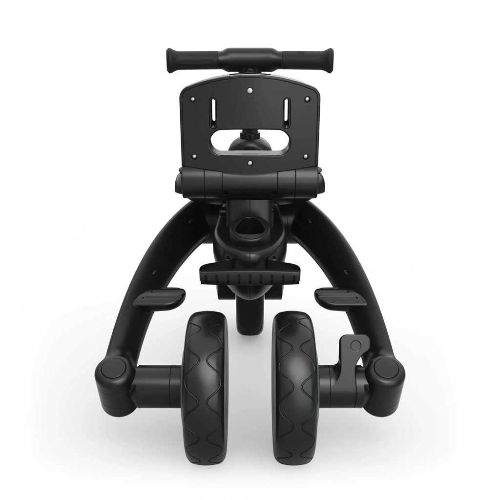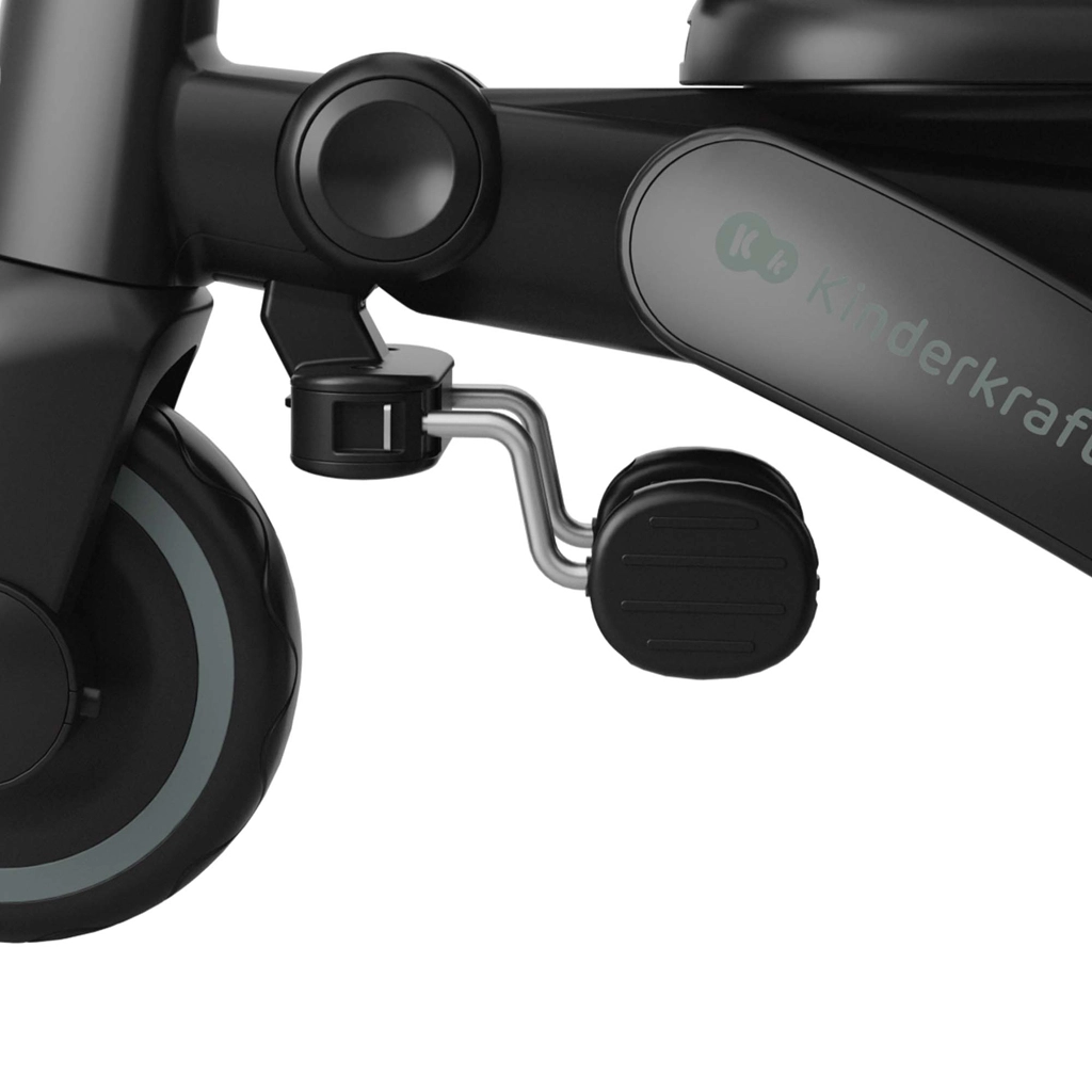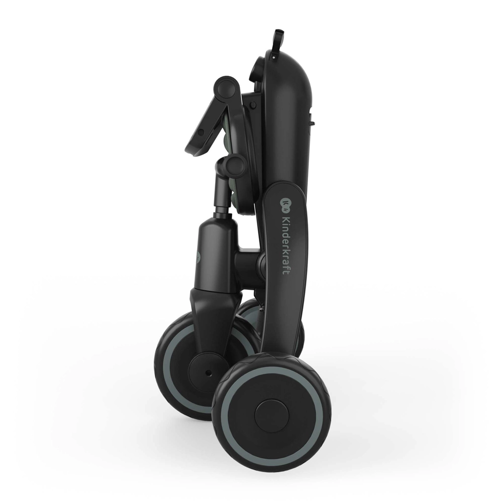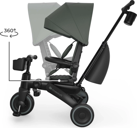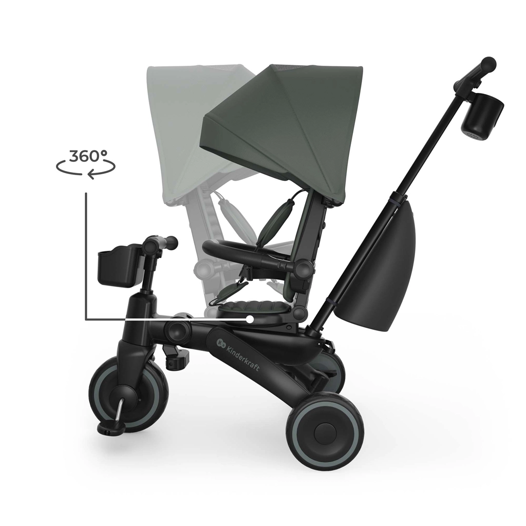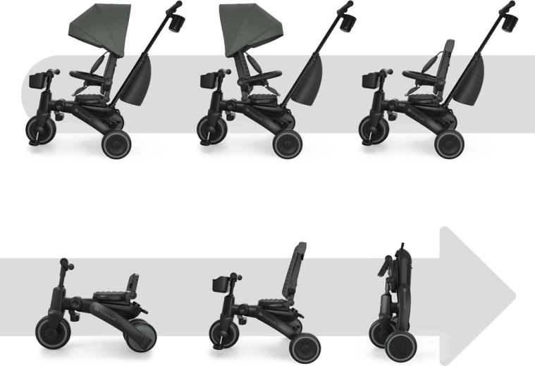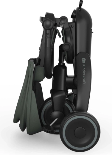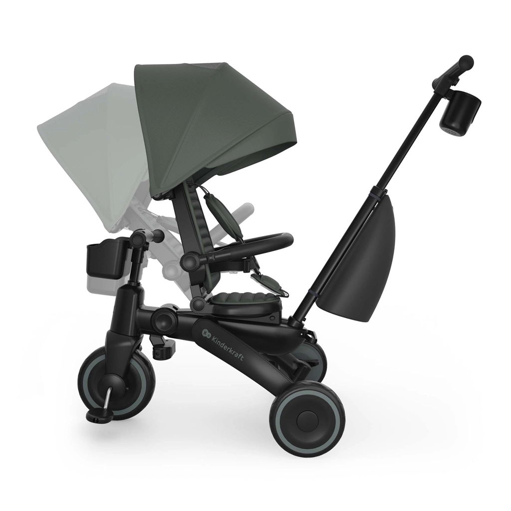 Sklopivi okvir s dvostrukom zaštitom osigurava brzo i sigurno sklapanje na kompaktne dimenzije. Tricikl se može stabilno odlagati u okomitom i vodoravnom položaju, što ćete cijeniti u stanu, dizalu i prtljažniku automobila. Velika kupola s filtrom UPF 50+ i vodoodbojnim premazom štiti od sunca i sitne kiše, ventilacijski panel i peek-a-boo prozorčić poboljšavaju protok zraka i kontakt s djetetom.