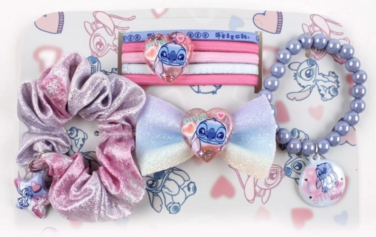 Uljepšajte svaku frizuru čarobnim setom dodataka za kosu u stilu STITCH. U praktičnoj torbici pronaći ćete ukosnice, gumice, mekanu scrunchie i odgovarajuću narukvicu – sve idealno za svaki dan i posebne prigode.