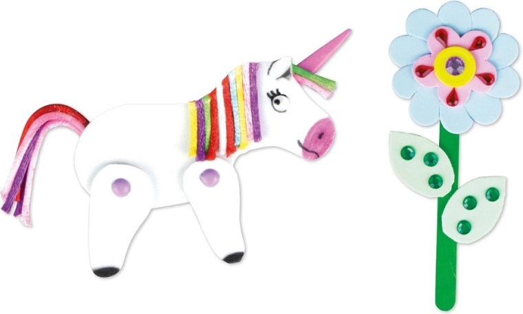 - cca 800 dijelova: šareni papiri, pjenasti oblici, dlakavi štapići, pokretne oči, pomponi, drvene štapiće, gumbići, konci i drugo